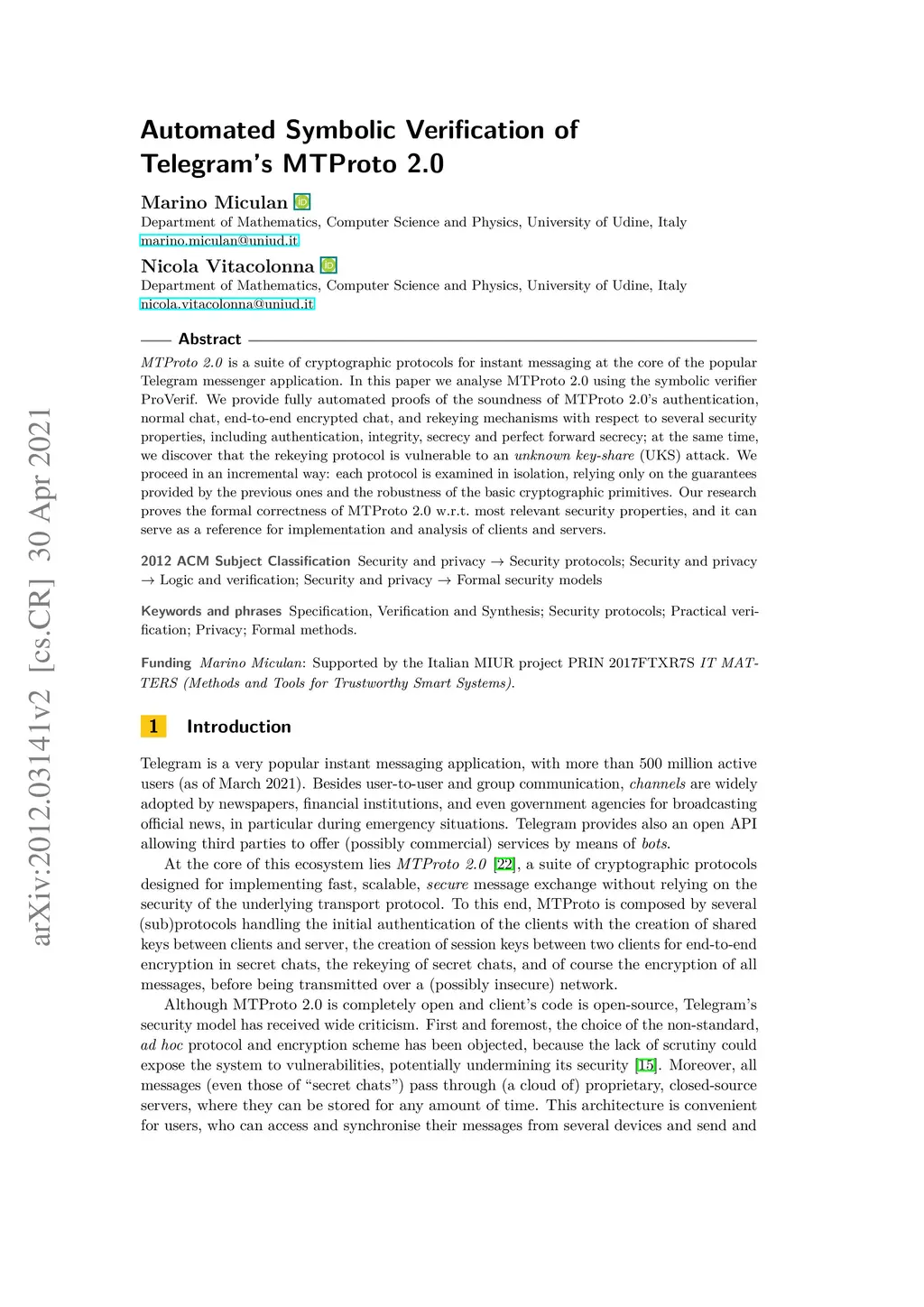 MTProto 2.0 is a suite of cryptographic protocols for instant messaging at the core of the popular Telegram messenger application. In this paper we analyse MTProto 2.0 using the symbolic verifier ProVerif. We provide fully automated proofs of the soundness of MTProto 2.0's authentication, normal chat, end-to-end encrypted chat, and rekeying mechanisms with respect to several security properties, including authentication, integrity, secrecy and perfect forward secrecy; at the same time, we discover that the rekeying protocol is vulnerable to an unknown key-share (UKS) attack. We proceed in an incremental way: each protocol is examined in isolation, relying only on the guarantees provided by the previous ones and the robustness of the basic cryptographic primitives. Our research proves the formal correctness of MTProto 2.0 w.r.t. most relevant security properties, and it can serve as a reference for implementation and analysis of clients and servers.