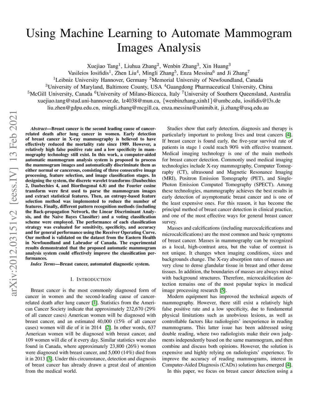 Breast cancer is the second leading cause of cancer-related death after lung cancer in women. Early detection of breast cancer in X-ray mammography is believed to have effectively reduced the mortality rate. However, a relatively high false positive rate and a low specificity in mammography technology still exist. In this work, a computer-aided automatic mammogram analysis system is proposed to process the mammogram images and automatically discriminate them as either normal or cancerous, consisting of three consecutive image processing, feature selection, and image classification stages. In designing the system, the discrete wavelet transforms (Daubechies 2, Daubechies 4, and Biorthogonal 6.8) and the Fourier cosine transform were first used to parse the mammogram images and extract statistical features. Then, an entropy-based feature selection method was implemented to reduce the number of features. Finally, different pattern recognition methods (including the Back-propagation Network, the Linear Discriminant Analysis, and the Naive Bayes Classifier) and a voting classification scheme were employed. The performance of each classification strategy was evaluated for sensitivity, specificity, and accuracy and for general performance using the Receiver Operating Curve. Our method is validated on the dataset from the Eastern Health in Newfoundland and Labrador of Canada. The experimental results demonstrated that the proposed automatic mammogram analysis system could effectively improve the classification performances.