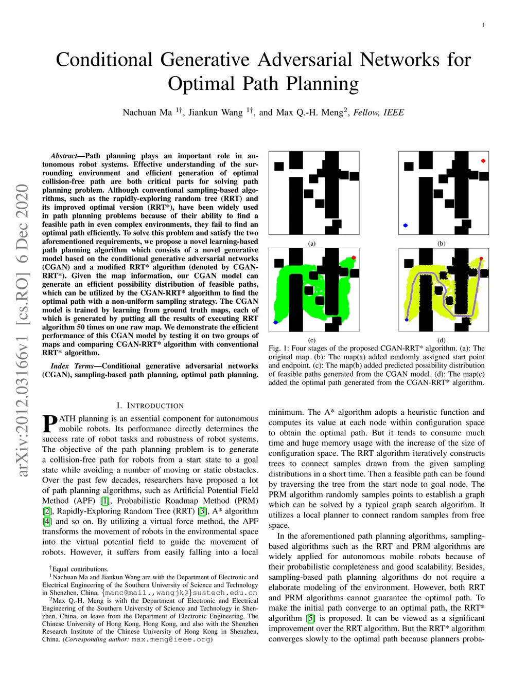 Path planning plays an important role in autonomous robot systems. Effective understanding of the surrounding environment and efficient generation of optimal collision-free path are both critical parts for solving path planning problem. Although conventional sampling-based algorithms, such as the rapidly-exploring random tree (RRT) and its improved optimal version (RRT*), have been widely used in path planning problems because of their ability to find a feasible path in even complex environments, they fail to find an optimal path efficiently. To solve this problem and satisfy the two aforementioned requirements, we propose a novel learning-based path planning algorithm which consists of a novel generative model based on the conditional generative adversarial networks (CGAN) and a modified RRT* algorithm (denoted by CGANRRT*). Given the map information, our CGAN model can generate an efficient possibility distribution of feasible paths, which can be utilized by the CGAN-RRT* algorithm to find the optimal path with a non-uniform sampling strategy. The CGAN model is trained by learning from ground truth maps, each of which is generated by putting all the results of executing RRT algorithm 50 times on one raw map. We demonstrate the efficient performance of this CGAN model by testing it on two groups of maps and comparing CGAN-RRT* algorithm with conventional RRT* algorithm.