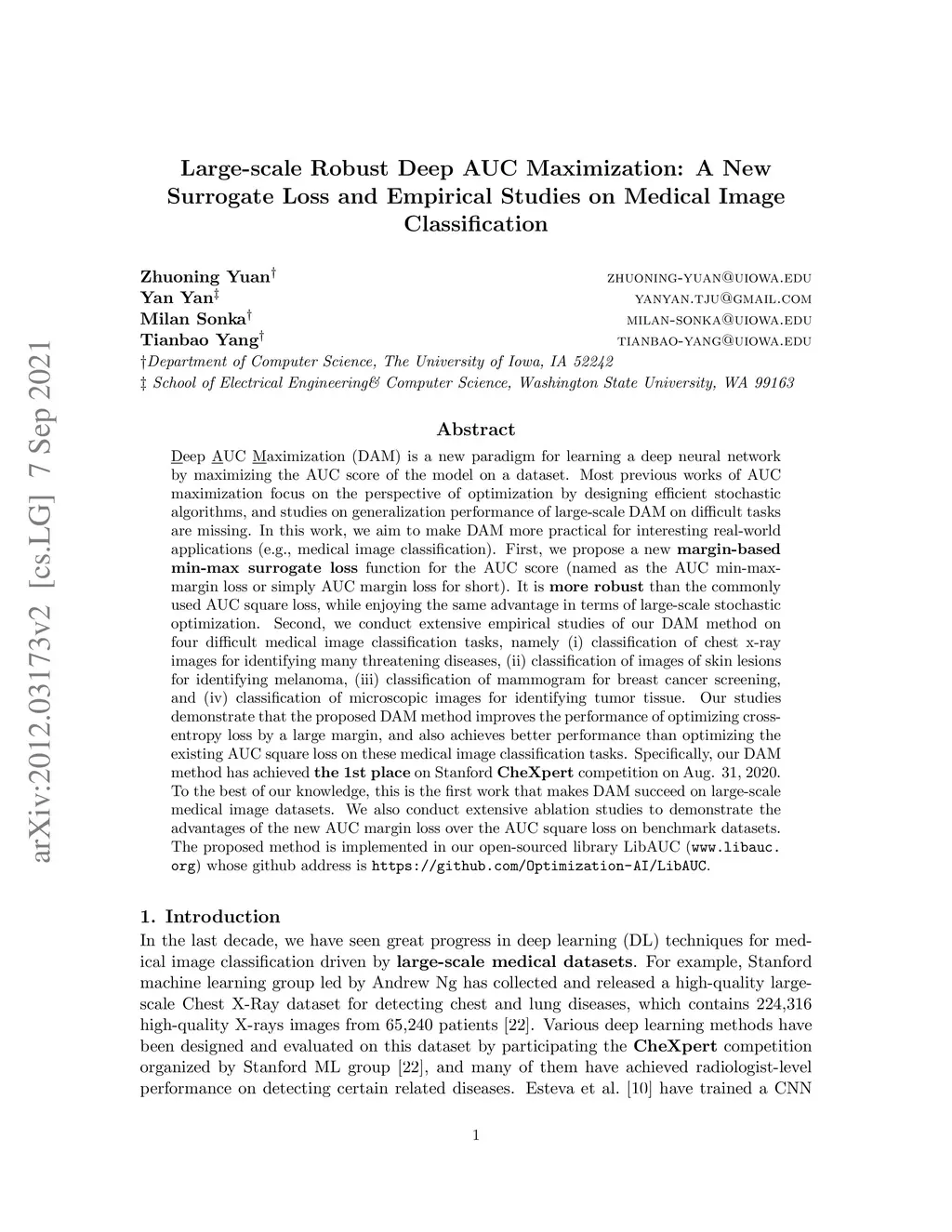 Deep AUC Maximization (DAM) is a new paradigm for learning a deep neural network by maximizing the AUC score of the model on a dataset. Most previous works of AUC maximization focus on the perspective of optimization by designing efficient stochastic algorithms, and studies on generalization performance of large-scale DAM on difficult tasks are missing. In this work, we aim to make DAM more practical for interesting real-world applications (e.g., medical image classification). First, we propose a new margin-based min-max surrogate loss function for the AUC score (named as AUC min-max-margin loss or simply AUC margin loss for short). It is more robust than the commonly used AUC square loss, while enjoying the same advantage in terms of large-scale stochastic optimization. Second, we conduct extensive empirical studies of our DAM method on four difficult medical image classification tasks, namely (i) classification of chest x-ray images for identifying many threatening diseases, (ii) classification of images of skin lesions for identifying melanoma, (iii) classification of mammogram for breast cancer screening, and (iv) classification of microscopic images for identifying tumor tissue. Our studies demonstrate that the proposed DAM method improves the performance of optimizing cross-entropy loss by a large margin, and also achieves better performance than optimizing the existing AUC square loss on these medical image classification tasks. Specifically, our DAM method has achieved the 1st place on Stanford CheXpert competition on Aug. 31, 2020. To the best of our knowledge, this is the first work that makes DAM succeed on large-scale medical image datasets. We also conduct extensive ablation studies to demonstrate the advantages of the new AUC margin loss over the AUC square loss on benchmark datasets. The proposed method is implemented in our open-sourced library LibAUC (www.libauc.org).