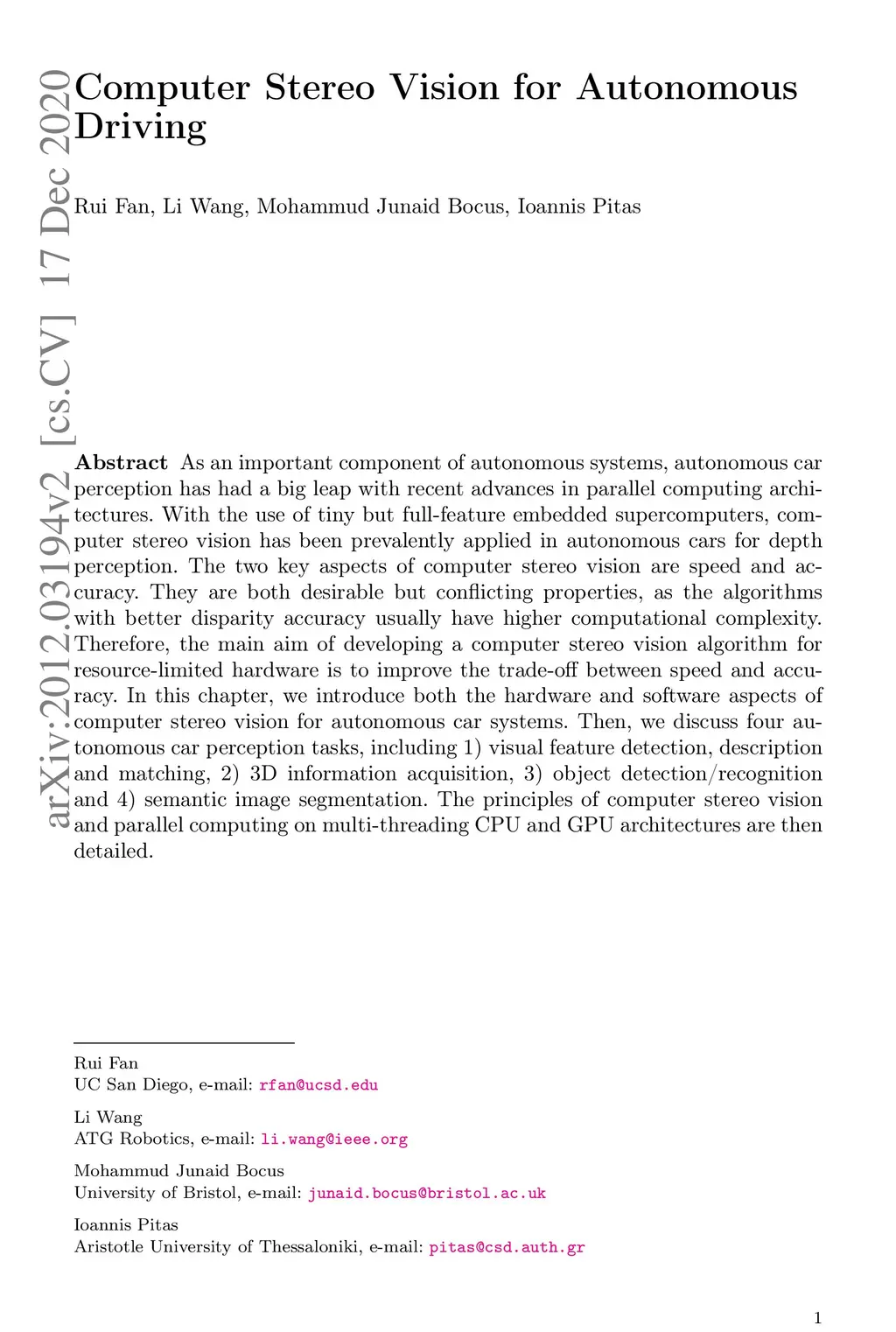 For a long time, autonomous cars were found only in science fiction movies and series but now they are becoming a reality. The opportunity to pick such a vehicle at your garage forecourt is closer than you think. As an important component of autonomous systems, autonomous car perception has had a big leap with recent advances in parallel computing architectures, such as OpenMP for multi-threading CPUs and OpenCL for GPUs. With the use of tiny but full-feature embedded supercomputers, computer stereo vision has been prevalently applied in autonomous cars for depth perception. The two key aspects of computer stereo vision are speed and accuracy. They are two desirable but conflicting properties -- the algorithms with better disparity accuracy usually have higher computational complexity. Therefore, the main aim of developing a computer stereo vision algorithm for resource-limited hardware is to improve the trade-off between speed and accuracy. In this chapter, we first introduce the autonomous car system, from the hardware aspect to the software aspect. We then discuss four autonomous car perception functionalities, including: 1) visual feature detection, description and matching, 2) 3D information acquisition, 3) object detection/recognition and 4) semantic image segmentation. Finally, we introduce the principles of computer stereo vision and parallel computing.