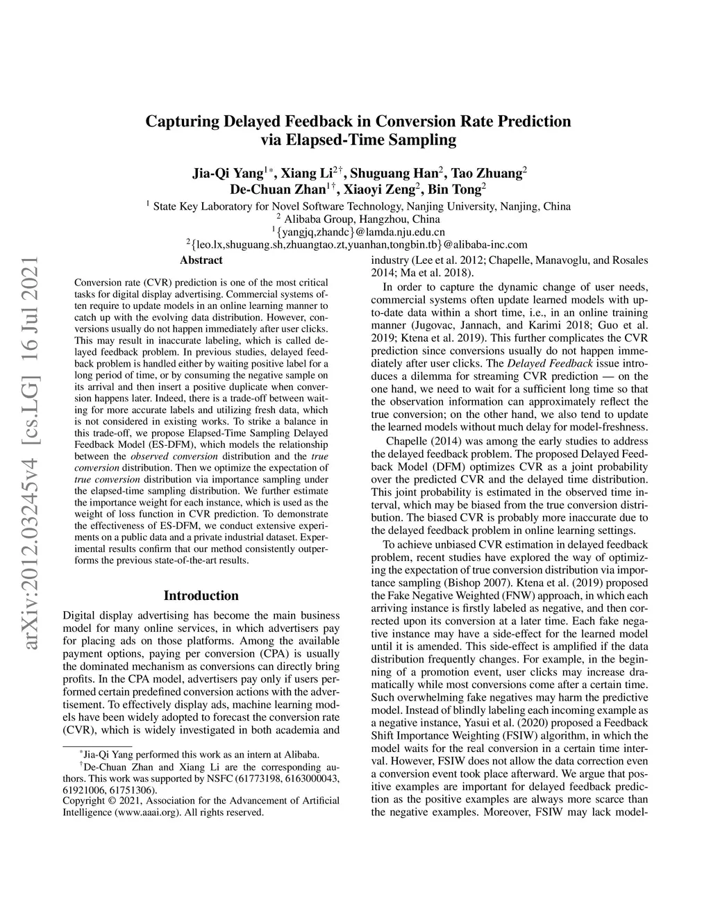 Conversion rate (CVR) prediction is one of the most critical tasks for digital display advertising. Commercial systems often require to update models in an online learning manner to catch up with the evolving data distribution. However, conversions usually do not happen immediately after a user click. This may result in inaccurate labeling, which is called delayed feedback problem. In previous studies, delayed feedback problem is handled either by waiting positive label for a long period of time, or by consuming the negative sample on its arrival and then insert a positive duplicate when a conversion happens later. Indeed, there is a trade-off between waiting for more accurate labels and utilizing fresh data, which is not considered in existing works. To strike a balance in this trade-off, we propose Elapsed-Time Sampling Delayed Feedback Model (ES-DFM), which models the relationship between the observed conversion distribution and the true conversion distribution. Then we optimize the expectation of true conversion distribution via importance sampling under the elapsed-time sampling distribution. We further estimate the importance weight for each instance, which is used as the weight of loss function in CVR prediction. To demonstrate the effectiveness of ES-DFM, we conduct extensive experiments on a public data and a private industrial dataset. Experimental results confirm that our method consistently outperforms the previous state-of-the-art results.