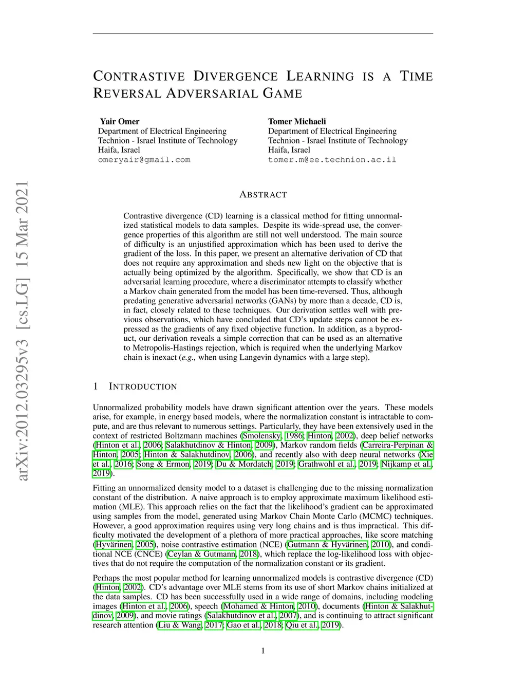 Contrastive Divergence Learning is a Time Reversal Adversarial Game
