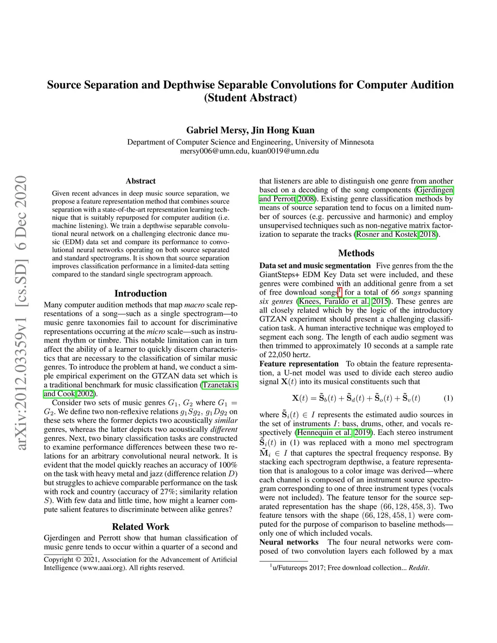 Given recent advances in deep music source separation, we propose a feature representation method that combines source separation with a state-of-the-art representation learning technique that is suitably repurposed for computer audition (i.e. machine listening). We train a depthwise separable convolutional neural network on a challenging electronic dance music (EDM) data set and compare its performance to convolutional neural networks operating on both source separated and standard spectrograms. It is shown that source separation improves classification performance in a limited-data setting compared to the standard single spectrogram approach.
