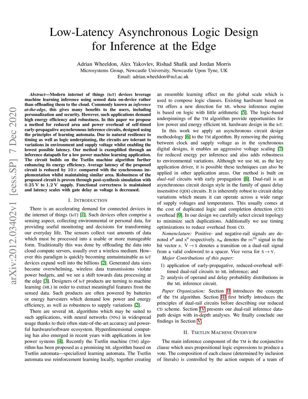 Modern internet of things (IoT) devices leverage machine learning inference using sensed data on-device rather than offloading them to the cloud. Commonly known as inference at-the-edge, this gives many benefits to the users, including personalization and security. However, such applications demand high energy efficiency and robustness. In this paper we propose a method for reduced area and power overhead of self-timed early-propagative asynchronous inference circuits, designed using the principles of learning automata. Due to natural resilience to timing as well as logic underpinning, the circuits are tolerant to variations in environment and supply voltage whilst enabling the lowest possible latency. Our method is exemplified through an inference datapath for a low power machine learning application. The circuit builds on the Tsetlin machine algorithm further enhancing its energy efficiency. Average latency of the proposed circuit is reduced by 10x compared with the synchronous implementation whilst maintaining similar area. Robustness of the proposed circuit is proven through post-synthesis simulation with 0.25 V to 1.2 V supply. Functional correctness is maintained and latency scales with gate delay as voltage is decreased.