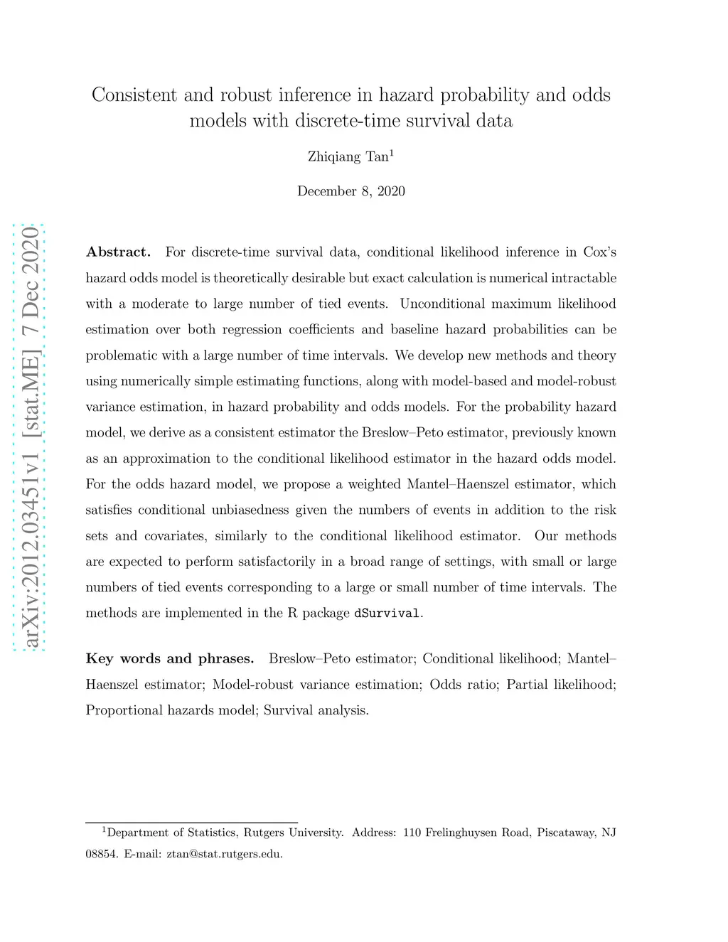 For discrete-time survival data, conditional likelihood inference in Cox's hazard odds model is theoretically desirable but exact calculation is numerical intractable with a moderate to large number of tied events. Unconditional maximum likelihood estimation over both regression coefficients and baseline hazard probabilities can be problematic with a large number of time intervals. We develop new methods and theory using numerically simple estimating functions, along with model-based and model-robust variance estimation, in hazard probability and odds models. For the probability hazard model, we derive as a consistent estimator the Breslow-Peto estimator, previously known as an approximation to the conditional likelihood estimator in the hazard odds model. For the odds hazard model, we propose a weighted Mantel-Haenszel estimator, which satisfies conditional unbiasedness given the numbers of events in addition to the risk sets and covariates, similarly to the conditional likelihood estimator. Our methods are expected to perform satisfactorily in a broad range of settings, with small or large numbers of tied events corresponding to a large or small number of time intervals. The methods are implemented in the R package dSurvival.