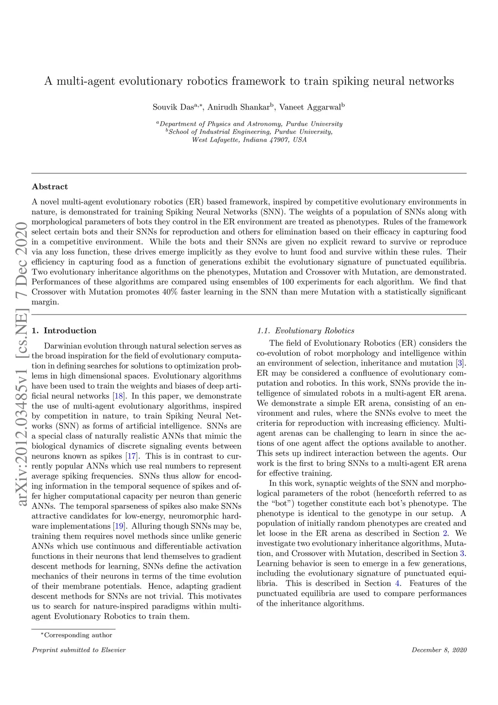 A novel multi-agent evolutionary robotics (ER) based framework, inspired by competitive evolutionary environments in nature, is demonstrated for training Spiking Neural Networks (SNN). The weights of a population of SNNs along with morphological parameters of bots they control in the ER environment are treated as phenotypes. Rules of the framework select certain bots and their SNNs for reproduction and others for elimination based on their efficacy in capturing food in a competitive environment. While the bots and their SNNs are given no explicit reward to survive or reproduce via any loss function, these drives emerge implicitly as they evolve to hunt food and survive within these rules. Their efficiency in capturing food as a function of generations exhibit the evolutionary signature of punctuated equilibria. Two evolutionary inheritance algorithms on the phenotypes, Mutation and Crossover with Mutation, are demonstrated. Performances of these algorithms are compared using ensembles of 100 experiments for each algorithm. We find that Crossover with Mutation promotes 40% faster learning in the SNN than mere Mutation with a statistically significant margin.