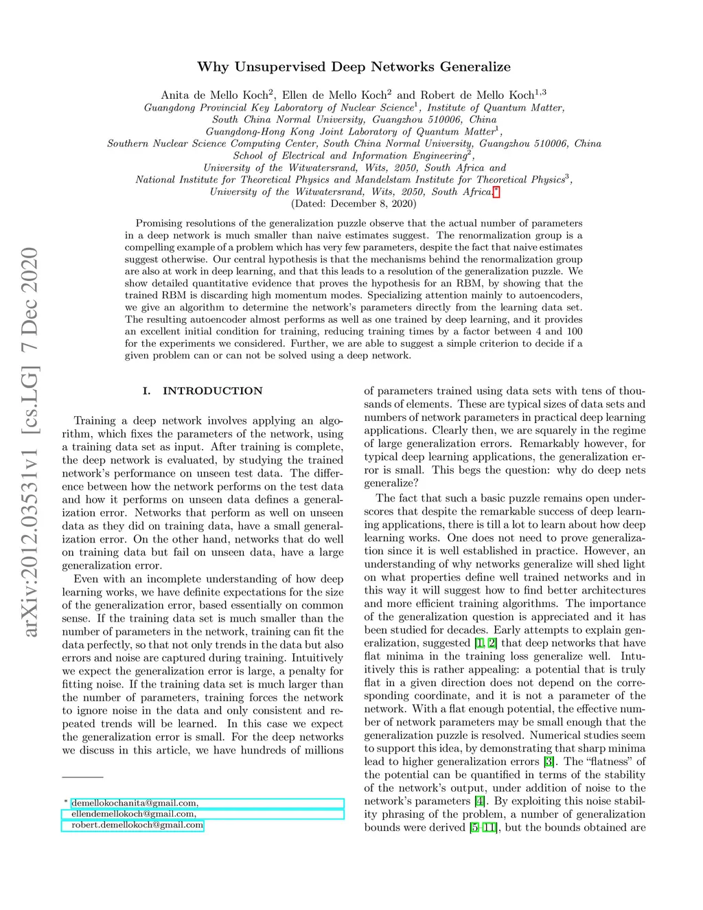 Promising resolutions of the generalization puzzle observe that the actual number of parameters in a deep network is much smaller than naive estimates suggest. The renormalization group is a compelling example of a problem which has very few parameters, despite the fact that naive estimates suggest otherwise. Our central hypothesis is that the mechanisms behind the renormalization group are also at work in deep learning, and that this leads to a resolution of the generalization puzzle. We show detailed quantitative evidence that proves the hypothesis for an RBM, by showing that the trained RBM is discarding high momentum modes. Specializing attention mainly to autoencoders, we give an algorithm to determine the network's parameters directly from the learning data set. The resulting autoencoder almost performs as well as one trained by deep learning, and it provides an excellent initial condition for training, reducing training times by a factor between 4 and 100 for the experiments we considered. Further, we are able to suggest a simple criterion to decide if a given problem can or can not be solved using a deep network.