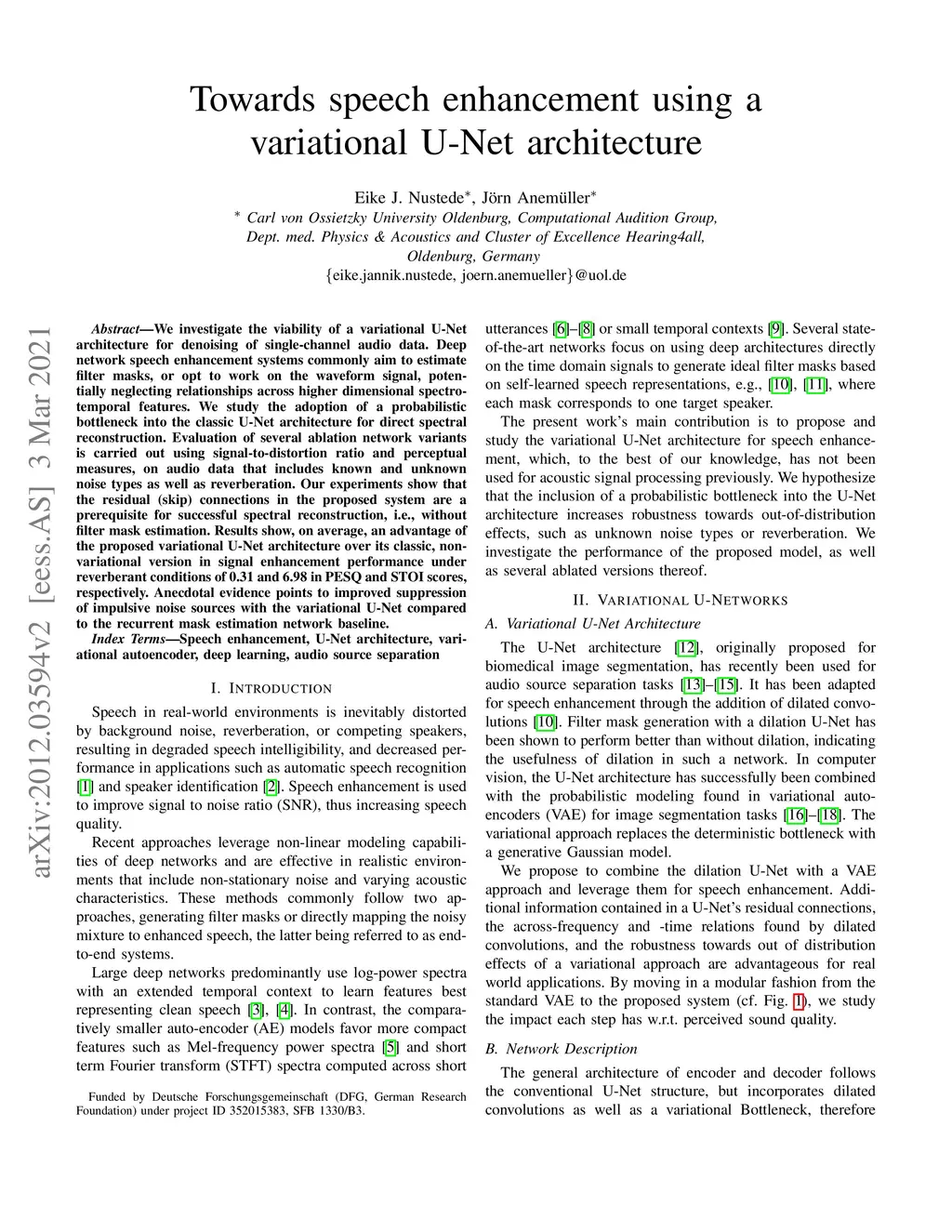 In this paper, we investigate the viability of a variational U-Net architecture for denoising of single-channel audio data. Deep network speech enhancement systems commonly aim to estimate filter masks, or opt to skip preprocessing steps to directly work on the waveform signal, potentially neglecting relationships across higher dimensional spectro-temporal features. We study the adoption of a probabilistic bottleneck, as well as dilated convolutions, into the classic U-Net architecture. Evaluation of a number of network variants is carried out using signal-to-distortion ratio and perceptual model scores, with audio data including known and unknown noise types as well as reverberation. Our experiments show that the residual (skip) connections in the proposed system are required for successful end-to-end signal enhancement, i.e., without filter mask estimation. Further, they indicate a slight advantage of the variational U-Net architecture over its non-variational version in terms of signal enhancement performance under reverberant conditions. Specifically, PESQ scores show increases of 0.28 and 0.49 in reverberant and non-reverberant scenes, respectively. Anecdotal evidence points to improved suppression of impulsive noise sources with the variational end-to-end U-Net compared to the recurrent mask estimation network baseline.