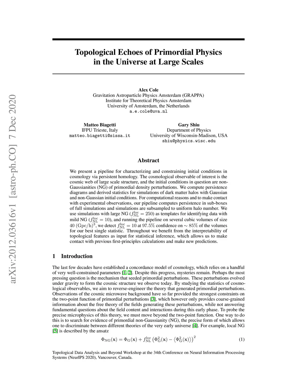 We present a pipeline for characterizing and constraining initial conditions in cosmology via persistent homology. The cosmological observable of interest is the cosmic web of large scale structure, and the initial conditions in question are non-Gaussianities (NG) of primordial density perturbations. We compute persistence diagrams and derived statistics for simulations of dark matter halos with Gaussian and non-Gaussian initial conditions. For computational reasons and to make contact with experimental observations, our pipeline computes persistence in sub-boxes of full simulations and simulations are subsampled to uniform halo number. We use simulations with large NG () as templates for identifying data with mild NG (), and running the pipeline on several cubic volumes of size , we detect at confidence on of the volumes for our best single statistic. Throughout we benefit from the interpretability of topological features as input for statistical inference, which allows us to make contact with previous first-principles calculations and make new predictions.