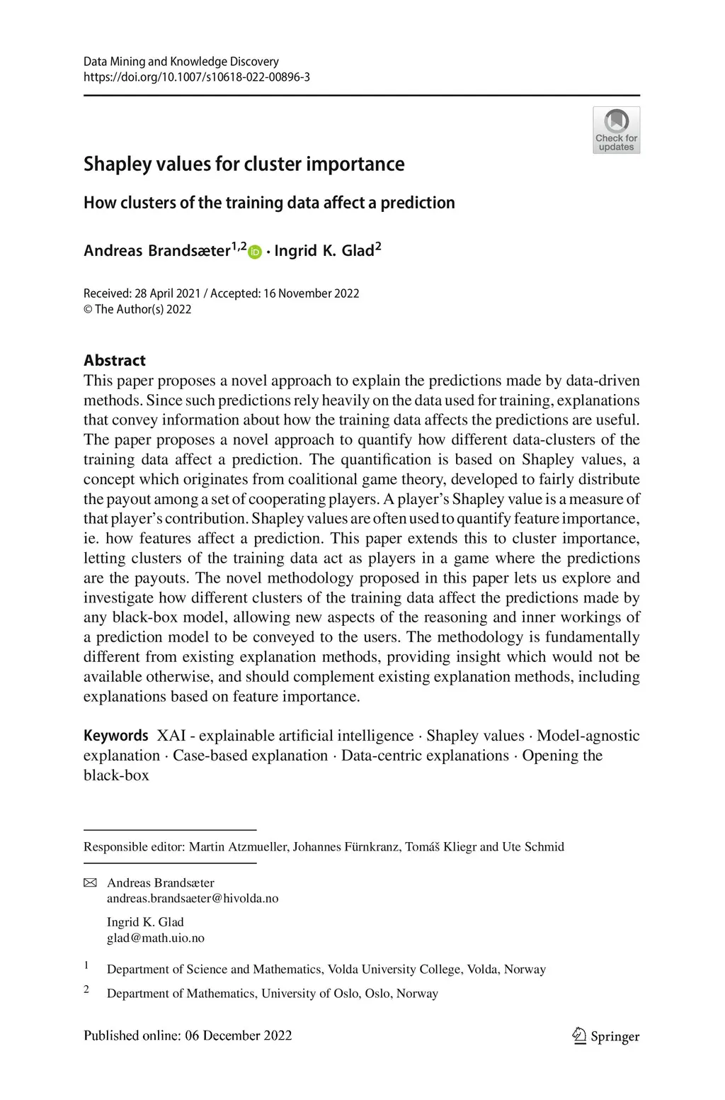 This paper proposes a novel approach to explain the predictions made by data-driven methods. Since such predictions rely heavily on the data used for training, explanations that convey information about how the training data affects the predictions are useful. The paper proposes a novel approach to quantify how different data-clusters of the training data affect a prediction. The quantification is based on Shapley values, a concept which originates from coalitional game theory, developed to fairly distribute the payout among a set of cooperating players. A player's Shapley value is a measure of that player's contribution. Shapley values are often used to quantify feature importance, ie. how features affect a prediction. This paper extends this to cluster importance, letting clusters of the training data act as players in a game where the predictions are the payouts. The novel methodology proposed in this paper lets us explore and investigate how different clusters of the training data affect the predictions made by any black-box model, allowing new aspects of the reasoning and inner workings of a prediction model to be conveyed to the users. The methodology is fundamentally different from existing explanation methods, providing insight which would not be available otherwise, and should complement existing explanation methods, including explanations based on feature importance.
