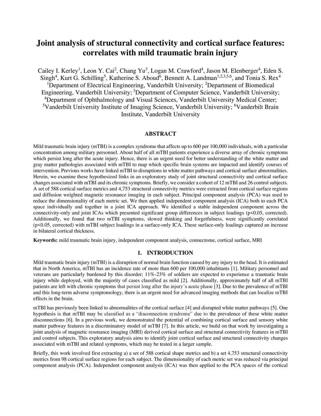 Mild traumatic brain injury (mTBI) is a complex syndrome that affects up to 600 per 100,000 individuals, with a particular concentration among military personnel. About half of all mTBI patients experience a diverse array of chronic symptoms which persist long after the acute injury. Hence, there is an urgent need for better understanding of the white matter and gray matter pathologies associated with mTBI to map which specific brain systems are impacted and identify courses of intervention. Previous works have linked mTBI to disruptions in white matter pathways and cortical surface abnormalities. Herein, we examine these hypothesized links in an exploratory study of joint structural connectivity and cortical surface changes associated with mTBI and its chronic symptoms. Briefly, we consider a cohort of 12 mTBI and 26 control subjects. A set of 588 cortical surface metrics and 4,753 structural connectivity metrics were extracted from cortical surface regions and diffusion weighted magnetic resonance imaging in each subject. Principal component analysis (PCA) was used to reduce the dimensionality of each metric set. We then applied independent component analysis (ICA) both to each PCA space individually and together in a joint ICA approach. We identified a stable independent component across the connectivity-only and joint ICAs which presented significant group differences in subject loadings (p<0.05, corrected). Additionally, we found that two mTBI symptoms, slowed thinking and forgetfulness, were significantly correlated (p<0.05, corrected) with mTBI subject loadings in a surface-only ICA. These surface-only loadings captured an increase in bilateral cortical thickness.