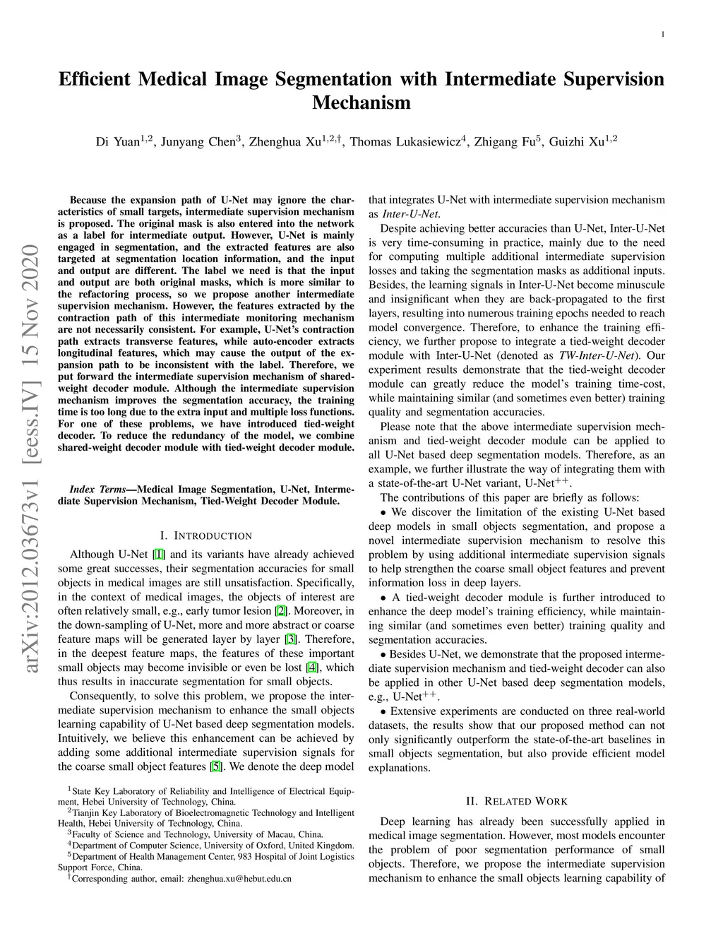 Because the expansion path of U-Net may ignore the characteristics of small targets, intermediate supervision mechanism is proposed. The original mask is also entered into the network as a label for intermediate output. However, U-Net is mainly engaged in segmentation, and the extracted features are also targeted at segmentation location information, and the input and output are different. The label we need is that the input and output are both original masks, which is more similar to the refactoring process, so we propose another intermediate supervision mechanism. However, the features extracted by the contraction path of this intermediate monitoring mechanism are not necessarily consistent. For example, U-Net's contraction path extracts transverse features, while auto-encoder extracts longitudinal features, which may cause the output of the expansion path to be inconsistent with the label. Therefore, we put forward the intermediate supervision mechanism of shared-weight decoder module. Although the intermediate supervision mechanism improves the segmentation accuracy, the training time is too long due to the extra input and multiple loss functions. For one of these problems, we have introduced tied-weight decoder. To reduce the redundancy of the model, we combine shared-weight decoder module with tied-weight decoder module.