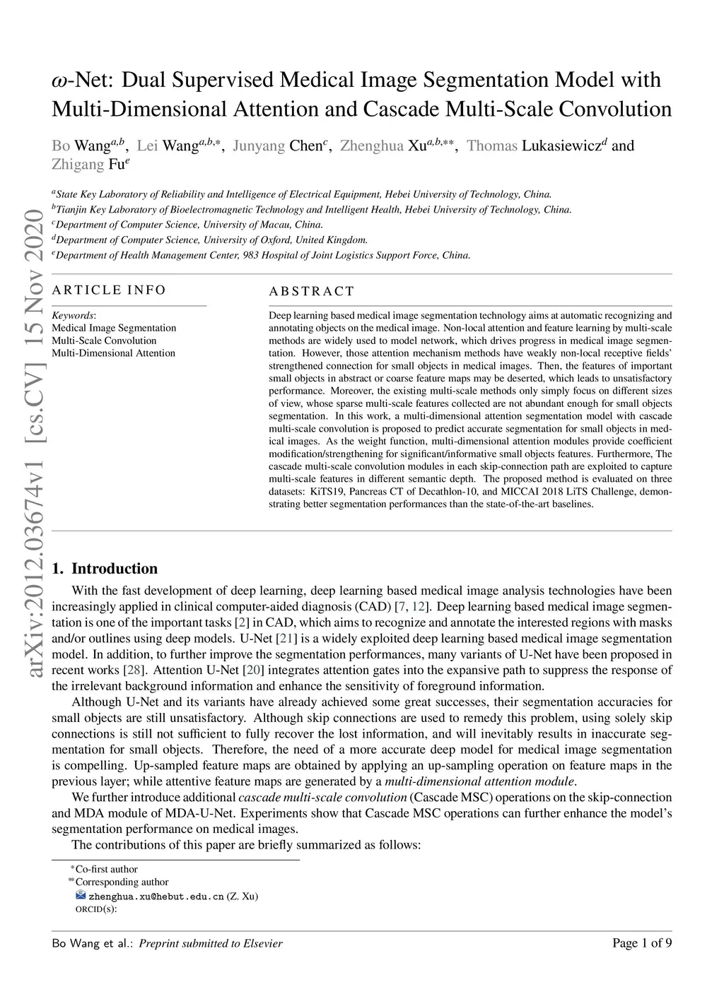 Deep learning-based medical image segmentation technology aims at automatic recognizing and annotating objects on the medical image. Non-local attention and feature learning by multi-scale methods are widely used to model network, which drives progress in medical image segmentation. However, those attention mechanism methods have weakly non-local receptive fields' strengthened connection for small objects in medical images. Then, the features of important small objects in abstract or coarse feature maps may be deserted, which leads to unsatisfactory performance. Moreover, the existing multi-scale methods only simply focus on different sizes of view, whose sparse multi-scale features collected are not abundant enough for small objects segmentation. In this work, a multi-dimensional attention segmentation model with cascade multi-scale convolution is proposed to predict accurate segmentation for small objects in medical images. As the weight function, multi-dimensional attention modules provide coefficient modification for significant/informative small objects features. Furthermore, The cascade multi-scale convolution modules in each skip-connection path are exploited to capture multi-scale features in different semantic depth. The proposed method is evaluated on three datasets: KiTS19, Pancreas CT of Decathlon-10, and MICCAI 2018 LiTS Challenge, demonstrating better segmentation performances than the state-of-the-art baselines.