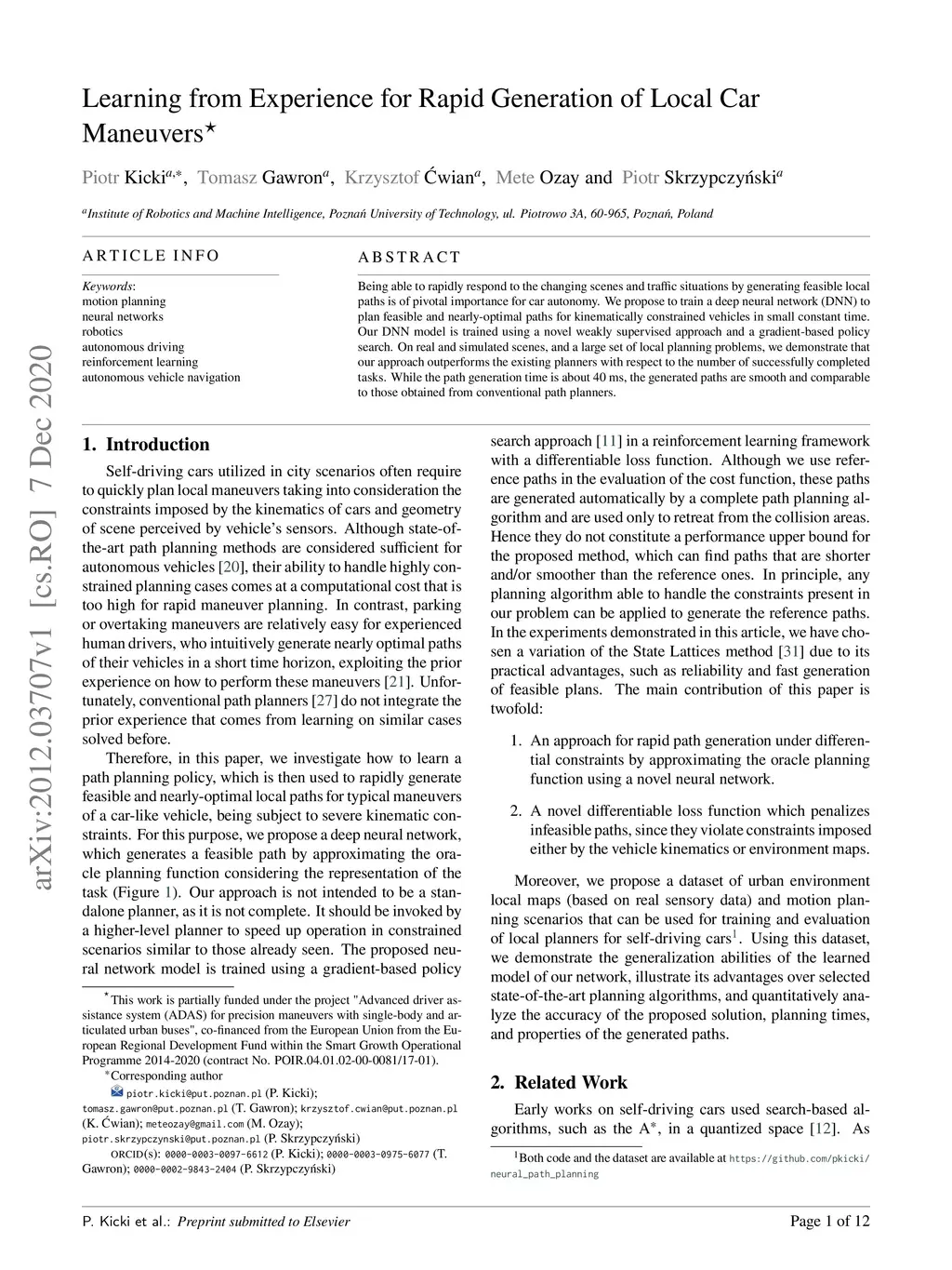 Learning from Experience for Rapid Generation of Local Car Maneuvers