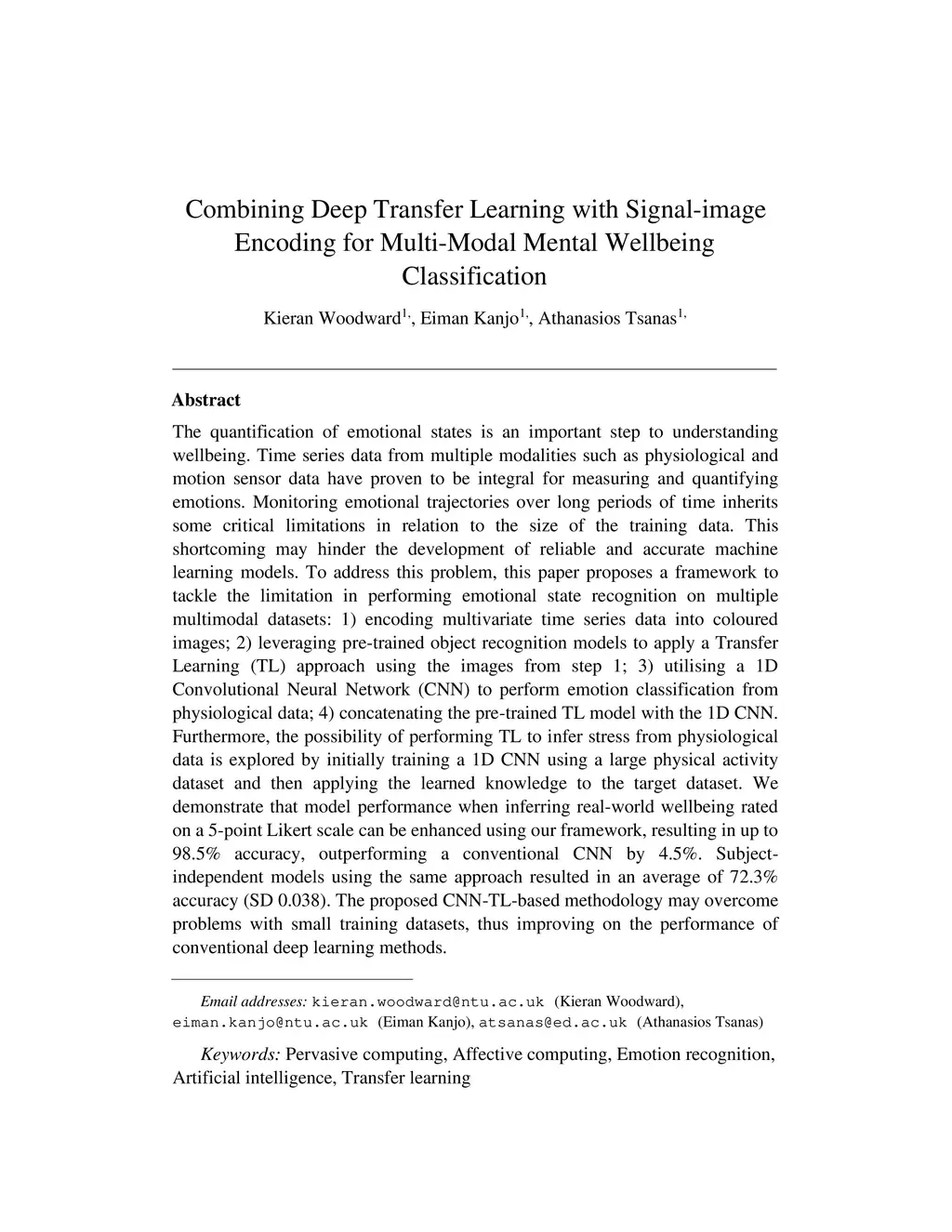 The quantification of emotional states is an important step to understanding wellbeing. Time series data from multiple modalities such as physiological and motion sensor data have proven to be integral for measuring and quantifying emotions. Monitoring emotional trajectories over long periods of time inherits some critical limitations in relation to the size of the training data. This shortcoming may hinder the development of reliable and accurate machine learning models. To address this problem, this paper proposes a framework to tackle the limitation in performing emotional state recognition on multiple multimodal datasets: 1) encoding multivariate time series data into coloured images; 2) leveraging pre-trained object recognition models to apply a Transfer Learning (TL) approach using the images from step 1; 3) utilising a 1D Convolutional Neural Network (CNN) to perform emotion classification from physiological data; 4) concatenating the pre-trained TL model with the 1D CNN. Furthermore, the possibility of performing TL to infer stress from physiological data is explored by initially training a 1D CNN using a large physical activity dataset and then applying the learned knowledge to the target dataset. We demonstrate that model performance when inferring real-world wellbeing rated on a 5-point Likert scale can be enhanced using our framework, resulting in up to 98.5% accuracy, outperforming a conventional CNN by 4.5%. Subject-independent models using the same approach resulted in an average of 72.3% accuracy (SD 0.038). The proposed CNN-TL-based methodology may overcome problems with small training datasets, thus improving on the performance of conventional deep learning methods.