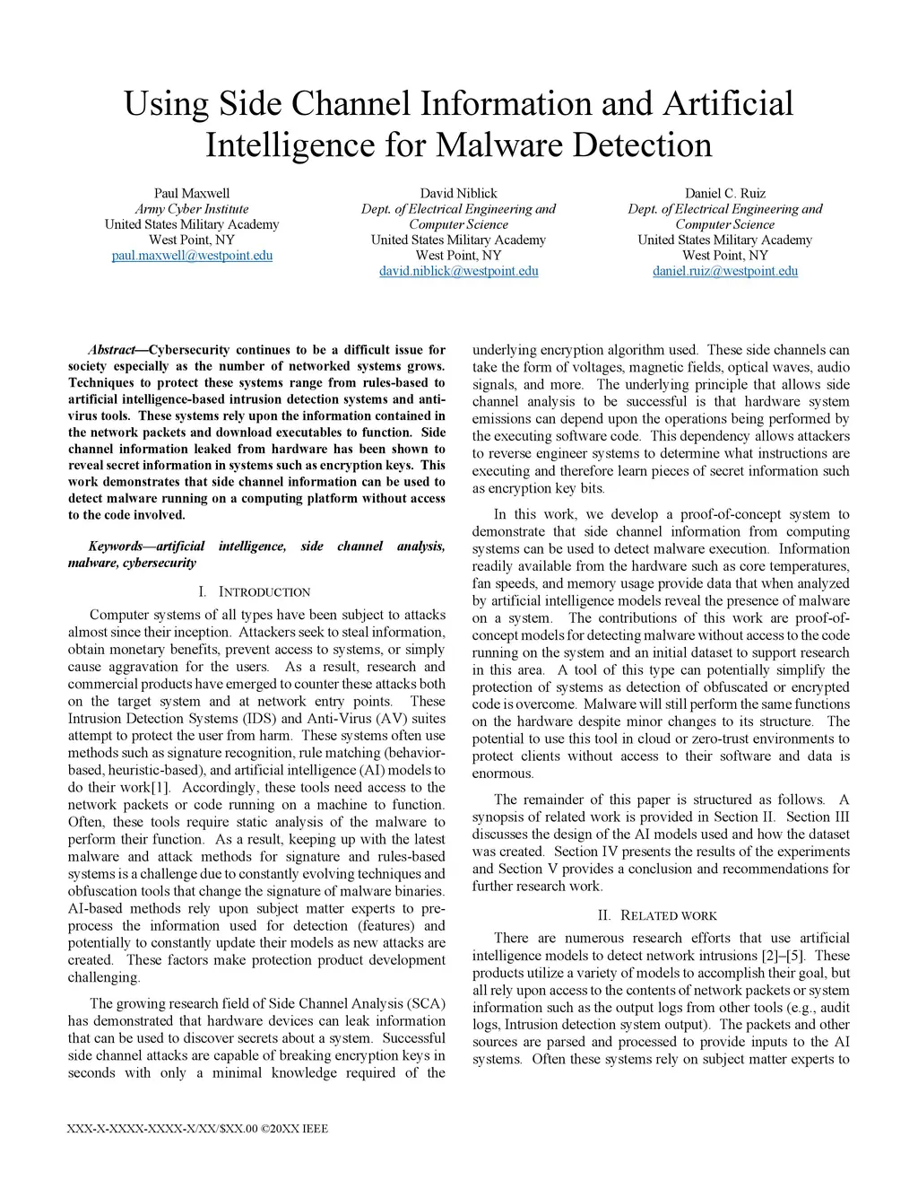 Cybersecurity continues to be a difficult issue for society especially as the number of networked systems grows. Techniques to protect these systems range from rules-based to artificial intelligence-based intrusion detection systems and anti-virus tools. These systems rely upon the information contained in the network packets and download executables to function. Side channel information leaked from hardware has been shown to reveal secret information in systems such as encryption keys. This work demonstrates that side channel information can be used to detect malware running on a computing platform without access to the code involved.