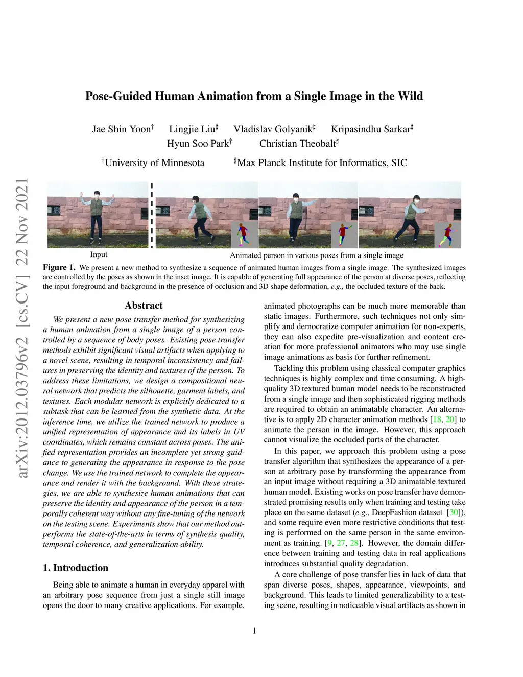 We present a new pose transfer method for synthesizing a human animation from a single image of a person controlled by a sequence of body poses. Existing pose transfer methods exhibit significant visual artifacts when applying to a novel scene, resulting in temporal inconsistency and failures in preserving the identity and textures of the person. To address these limitations, we design a compositional neural network that predicts the silhouette, garment labels, and textures. Each modular network is explicitly dedicated to a subtask that can be learned from the synthetic data. At the inference time, we utilize the trained network to produce a unified representation of appearance and its labels in UV coordinates, which remains constant across poses. The unified representation provides an incomplete yet strong guidance to generating the appearance in response to the pose change. We use the trained network to complete the appearance and render it with the background. With these strategies, we are able to synthesize human animations that can preserve the identity and appearance of the person in a temporally coherent way without any fine-tuning of the network on the testing scene. Experiments show that our method outperforms the state-of-the-arts in terms of synthesis quality, temporal coherence, and generalization ability.