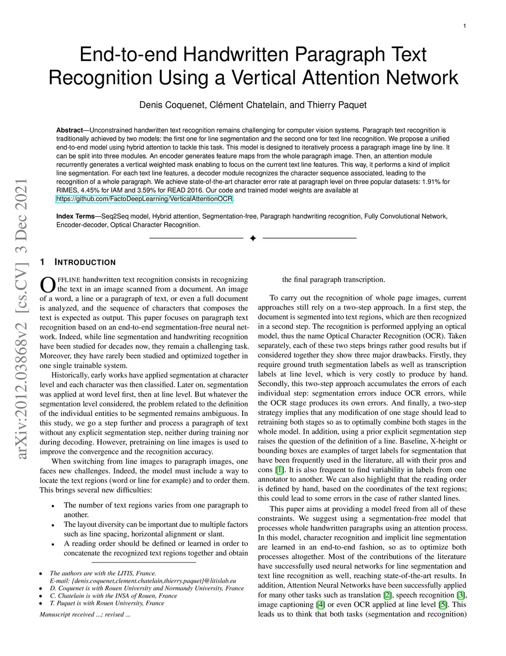 End-to-end Handwritten Paragraph Text Recognition Using a Vertical