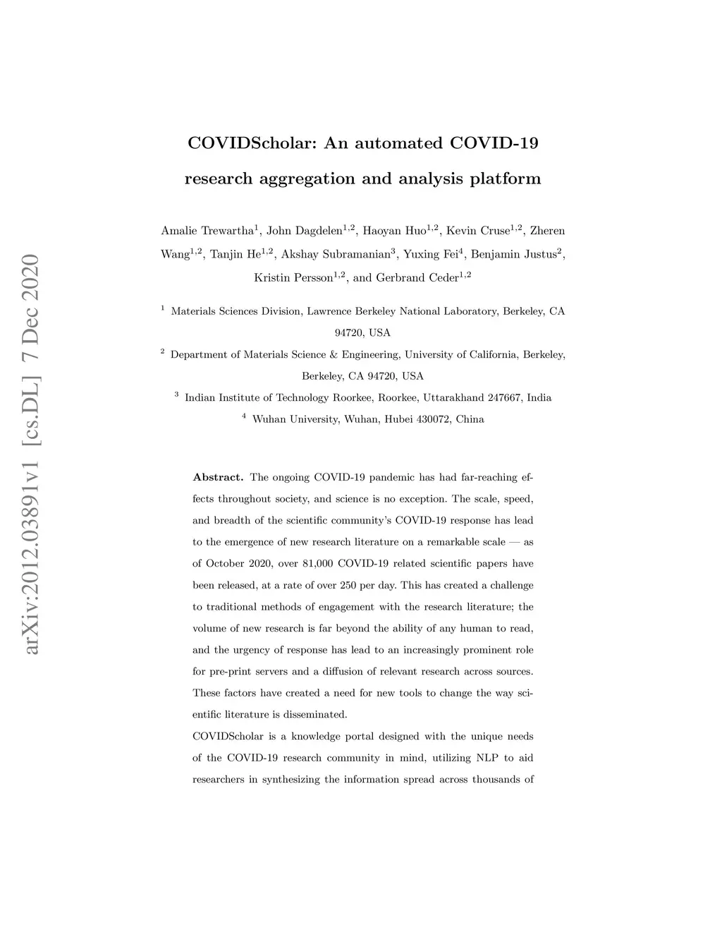 The ongoing COVID-19 pandemic has had far-reaching effects throughout society, and science is no exception. The scale, speed, and breadth of the scientific community's COVID-19 response has lead to the emergence of new research literature on a remarkable scale -- as of October 2020, over 81,000 COVID-19 related scientific papers have been released, at a rate of over 250 per day. This has created a challenge to traditional methods of engagement with the research literature; the volume of new research is far beyond the ability of any human to read, and the urgency of response has lead to an increasingly prominent role for pre-print servers and a diffusion of relevant research across sources. These factors have created a need for new tools to change the way scientific literature is disseminated. COVIDScholar is a knowledge portal designed with the unique needs of the COVID-19 research community in mind, utilizing NLP to aid researchers in synthesizing the information spread across thousands of emergent research articles, patents, and clinical trials into actionable insights and new knowledge. The search interface for this corpus, https://covidscholar.org, now serves over 2000 unique users weekly. We present also an analysis of trends in COVID-19 research over the course of 2020.