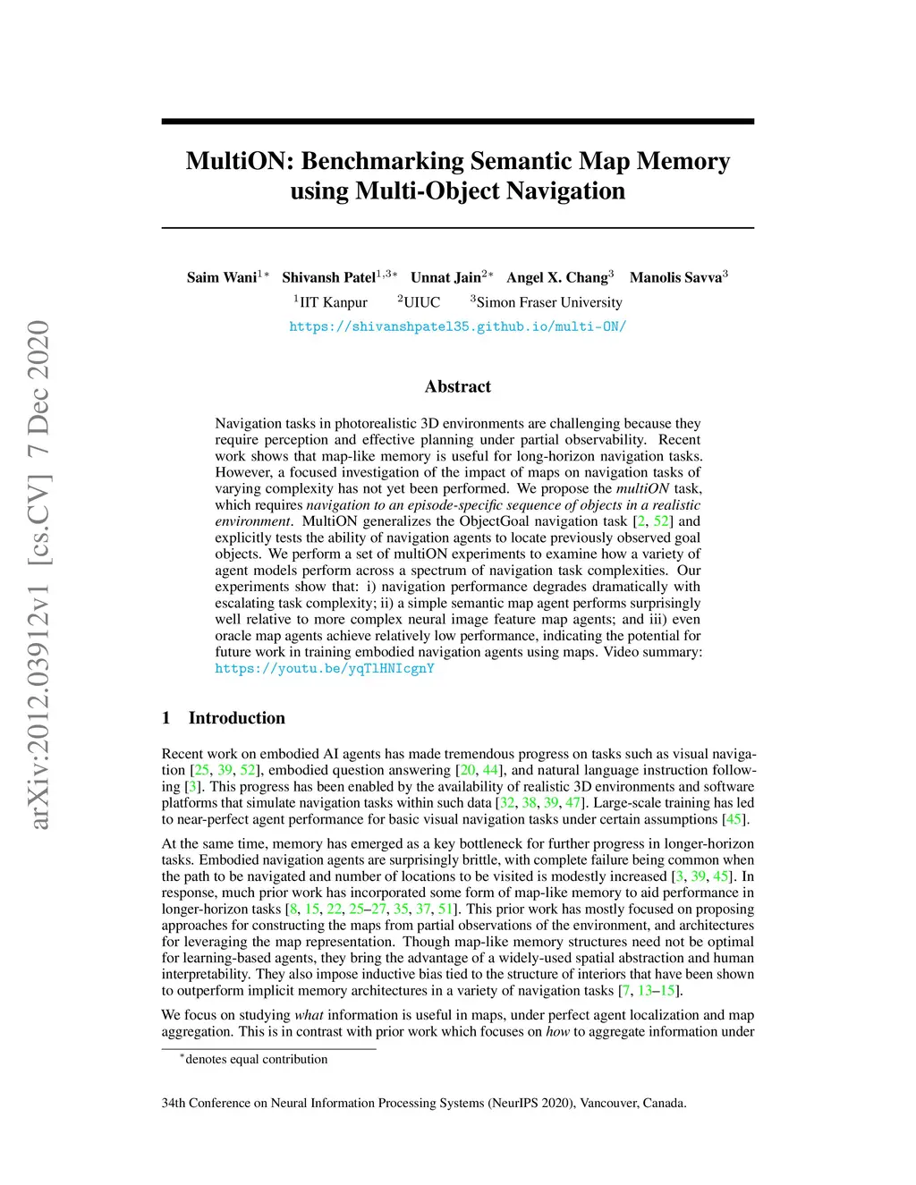 MultiON: Benchmarking Semantic Map Memory using Multi-Object Navigation