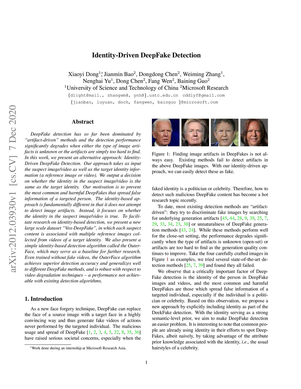 DeepFake detection has so far been dominated by ``artifact-driven'' methods and the detection performance significantly degrades when either the type of image artifacts is unknown or the artifacts are simply too hard to find. In this work, we present an alternative approach: Identity-Driven DeepFake Detection. Our approach takes as input the suspect image/video as well as the target identity information (a reference image or video). We output a decision on whether the identity in the suspect image/video is the same as the target identity. Our motivation is to prevent the most common and harmful DeepFakes that spread false information of a targeted person. The identity-based approach is fundamentally different in that it does not attempt to detect image artifacts. Instead, it focuses on whether the identity in the suspect image/video is true. To facilitate research on identity-based detection, we present a new large scale dataset ``Vox-DeepFake", in which each suspect content is associated with multiple reference images collected from videos of a target identity. We also present a simple identity-based detection algorithm called the OuterFace, which may serve as a baseline for further research. Even trained without fake videos, the OuterFace algorithm achieves superior detection accuracy and generalizes well to different DeepFake methods, and is robust with respect to video degradation techniques -- a performance not achievable with existing detection algorithms.