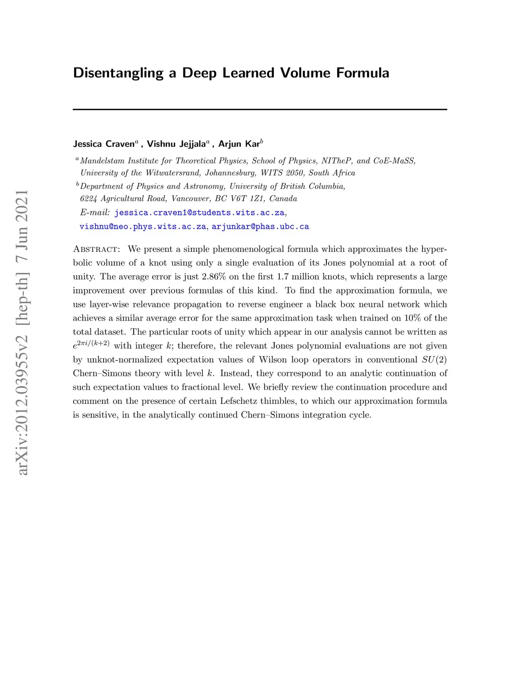 We present a simple phenomenological formula which approximates the hyperbolic volume of a knot using only a single evaluation of its Jones polynomial at a root of unity. The average error is just % on the first million knots, which represents a large improvement over previous formulas of this kind. To find the approximation formula, we use layer-wise relevance propagation to reverse engineer a black box neural network which achieves a similar average error for the same approximation task when trained on % of the total dataset. The particular roots of unity which appear in our analysis cannot be written as with integer ; therefore, the relevant Jones polynomial evaluations are not given by unknot-normalized expectation values of Wilson loop operators in conventional ChernSimons theory with level . Instead, they correspond to an analytic continuation of such expectation values to fractional level. We briefly review the continuation procedure and comment on the presence of certain Lefschetz thimbles, to which our approximation formula is sensitive, in the analytically continued ChernSimons integration cycle.