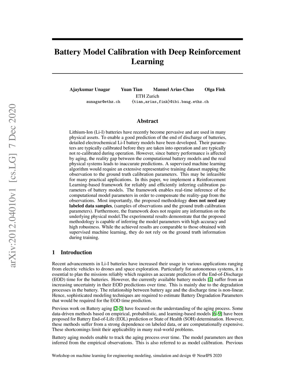 Lithium-Ion (Li-I) batteries have recently become pervasive and are used in many physical assets. To enable a good prediction of the end of discharge of batteries, detailed electrochemical Li-I battery models have been developed. Their parameters are typically calibrated before they are taken into operation and are typically not re-calibrated during operation. However, since battery performance is affected by aging, the reality gap between the computational battery models and the real physical systems leads to inaccurate predictions. A supervised machine learning algorithm would require an extensive representative training dataset mapping the observation to the ground truth calibration parameters. This may be infeasible for many practical applications. In this paper, we implement a Reinforcement Learning-based framework for reliably and efficiently inferring calibration parameters of battery models. The framework enables real-time inference of the computational model parameters in order to compensate the reality-gap from the observations. Most importantly, the proposed methodology does not need any labeled data samples, (samples of observations and the ground truth calibration parameters). Furthermore, the framework does not require any information on the underlying physical model. The experimental results demonstrate that the proposed methodology is capable of inferring the model parameters with high accuracy and high robustness. While the achieved results are comparable to those obtained with supervised machine learning, they do not rely on the ground truth information during training.