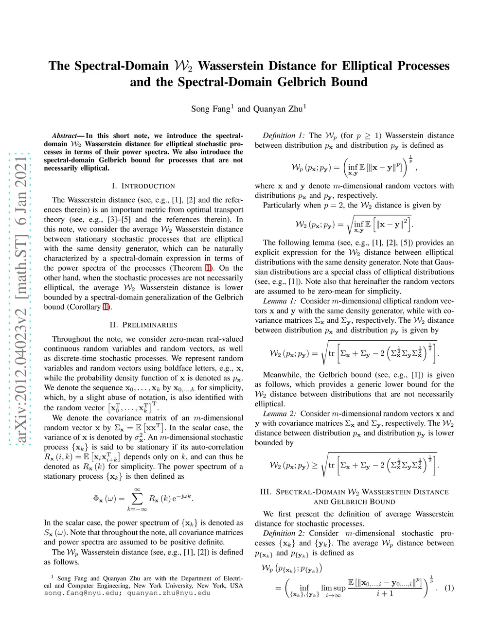 In this short note, we introduce the spectral-domain Wasserstein distance for elliptical stochastic processes in terms of their power spectra. We also introduce the spectral-domain Gelbrich bound for processes that are not necessarily elliptical.