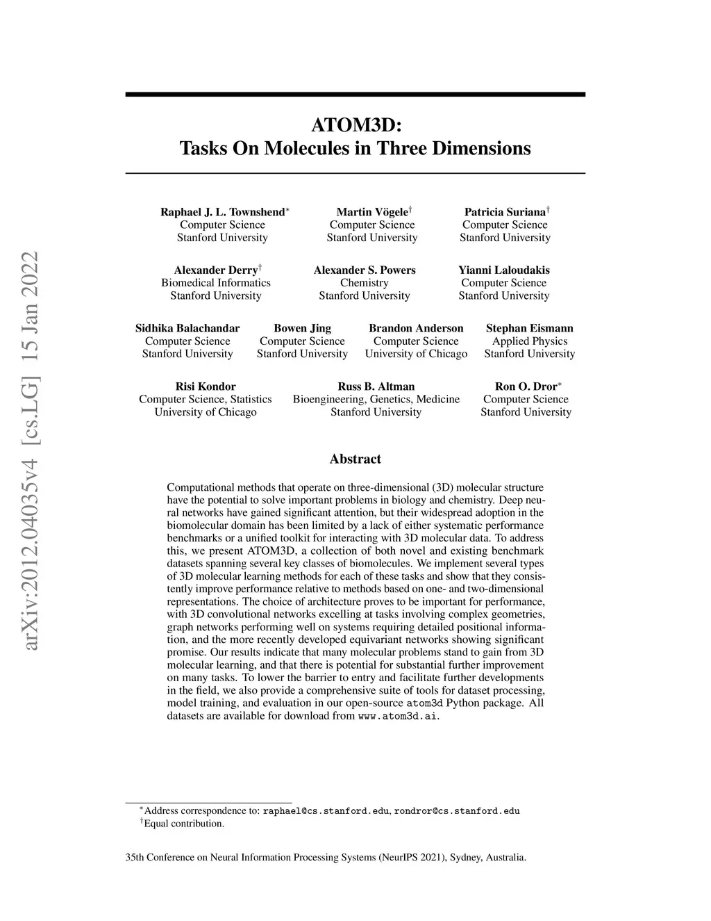 ATOM3D: Tasks On Molecules in Three Dimensions