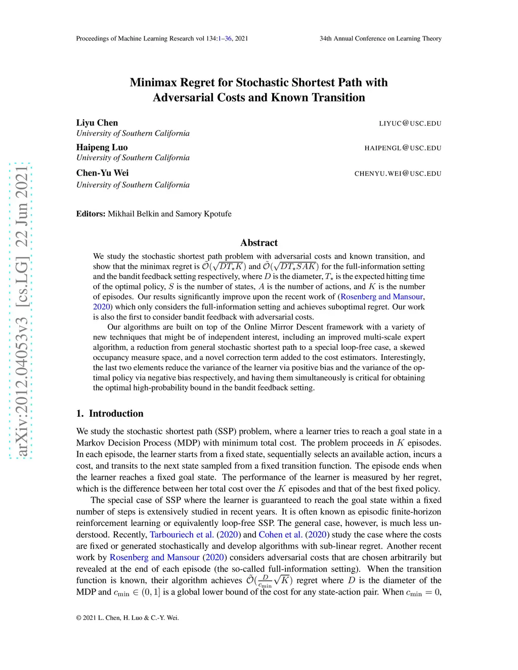 We study the stochastic shortest path problem with adversarial costs and known transition, and show that the minimax regret is and for the full-information setting and the bandit feedback setting respectively, where is the diameter, is the expected hitting time of the optimal policy, is the number of states, is the number of actions, and is the number of episodes. Our results significantly improve upon the existing work of (Rosenberg and Mansour, 2020) which only considers the full-information setting and achieves suboptimal regret. Our work is also the first to consider bandit feedback with adversarial costs. Our algorithms are built on top of the Online Mirror Descent framework with a variety of new techniques that might be of independent interest, including an improved multi-scale expert algorithm, a reduction from general stochastic shortest path to a special loop-free case, a skewed occupancy measure space, and a novel correction term added to the cost estimators. Interestingly, the last two elements reduce the variance of the learner via positive bias and the variance of the optimal policy via negative bias respectively, and having them simultaneously is critical for obtaining the optimal high-probability bound in the bandit feedback setting.