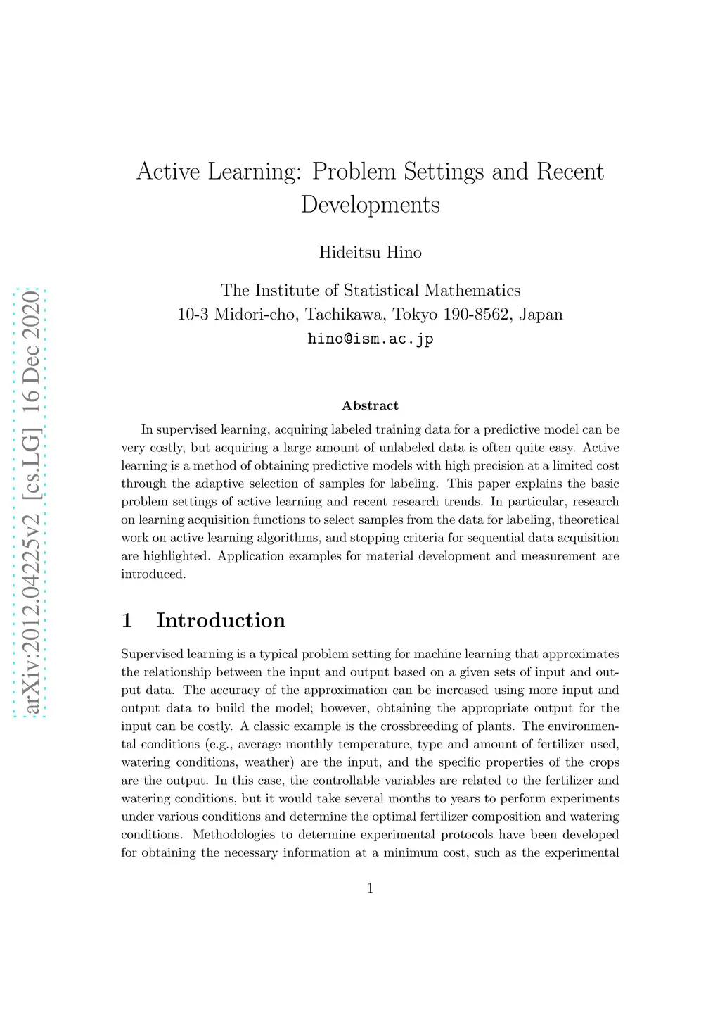 In supervised learning, acquiring labeled training data for a predictive model can be very costly, but acquiring a large amount of unlabeled data is often quite easy. Active learning is a method of obtaining predictive models with high precision at a limited cost through the adaptive selection of samples for labeling. This paper explains the basic problem settings of active learning and recent research trends. In particular, research on learning acquisition functions to select samples from the data for labeling, theoretical work on active learning algorithms, and stopping criteria for sequential data acquisition are highlighted. Application examples for material development and measurement are introduced.