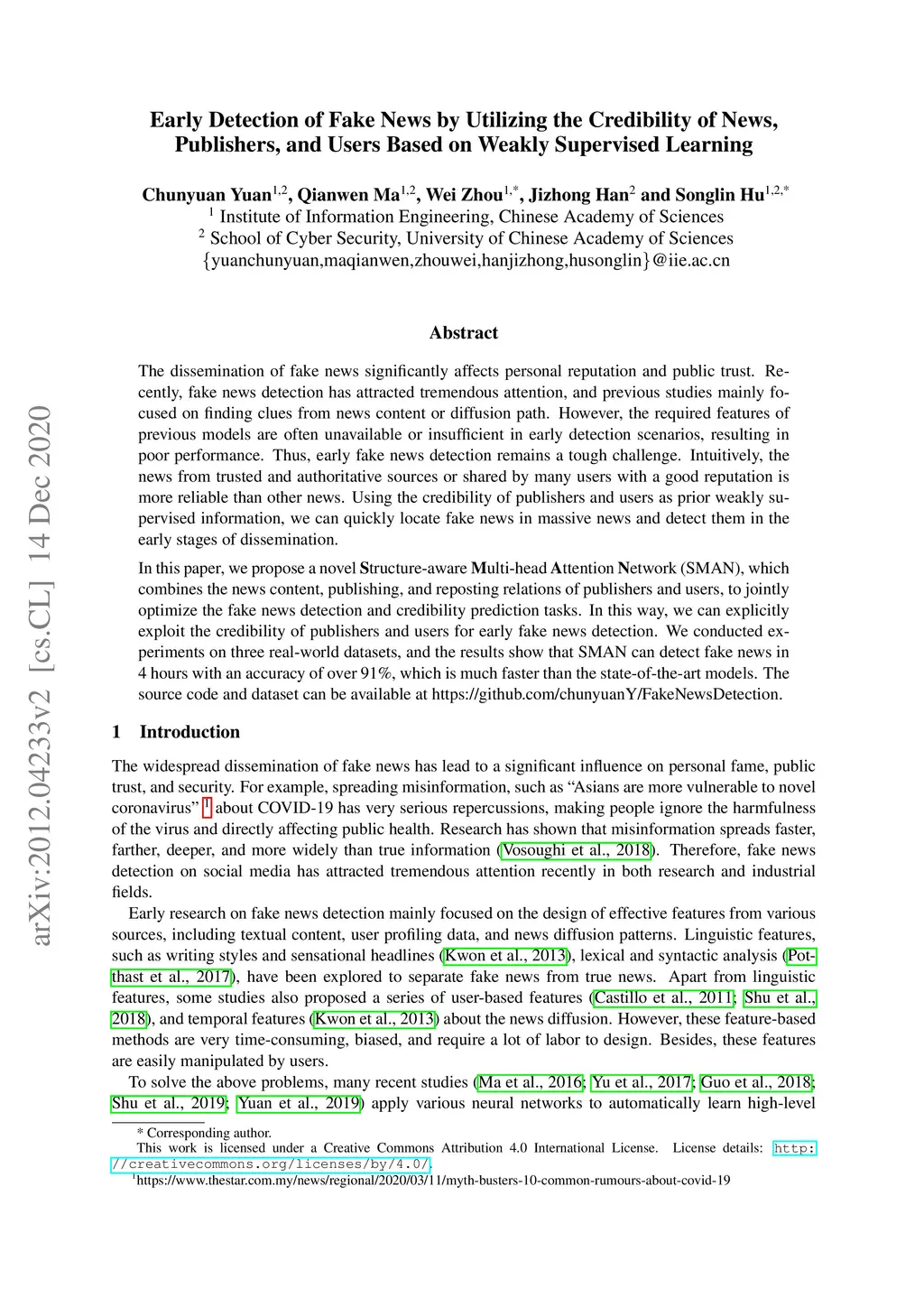 The dissemination of fake news significantly affects personal reputation and public trust. Recently, fake news detection has attracted tremendous attention, and previous studies mainly focused on finding clues from news content or diffusion path. However, the required features of previous models are often unavailable or insufficient in early detection scenarios, resulting in poor performance. Thus, early fake news detection remains a tough challenge. Intuitively, the news from trusted and authoritative sources or shared by many users with a good reputation is more reliable than other news. Using the credibility of publishers and users as prior weakly supervised information, we can quickly locate fake news in massive news and detect them in the early stages of dissemination. In this paper, we propose a novel Structure-aware Multi-head Attention Network (SMAN), which combines the news content, publishing, and reposting relations of publishers and users, to jointly optimize the fake news detection and credibility prediction tasks. In this way, we can explicitly exploit the credibility of publishers and users for early fake news detection. We conducted experiments on three real-world datasets, and the results show that SMAN can detect fake news in 4 hours with an accuracy of over 91%, which is much faster than the state-of-the-art models.