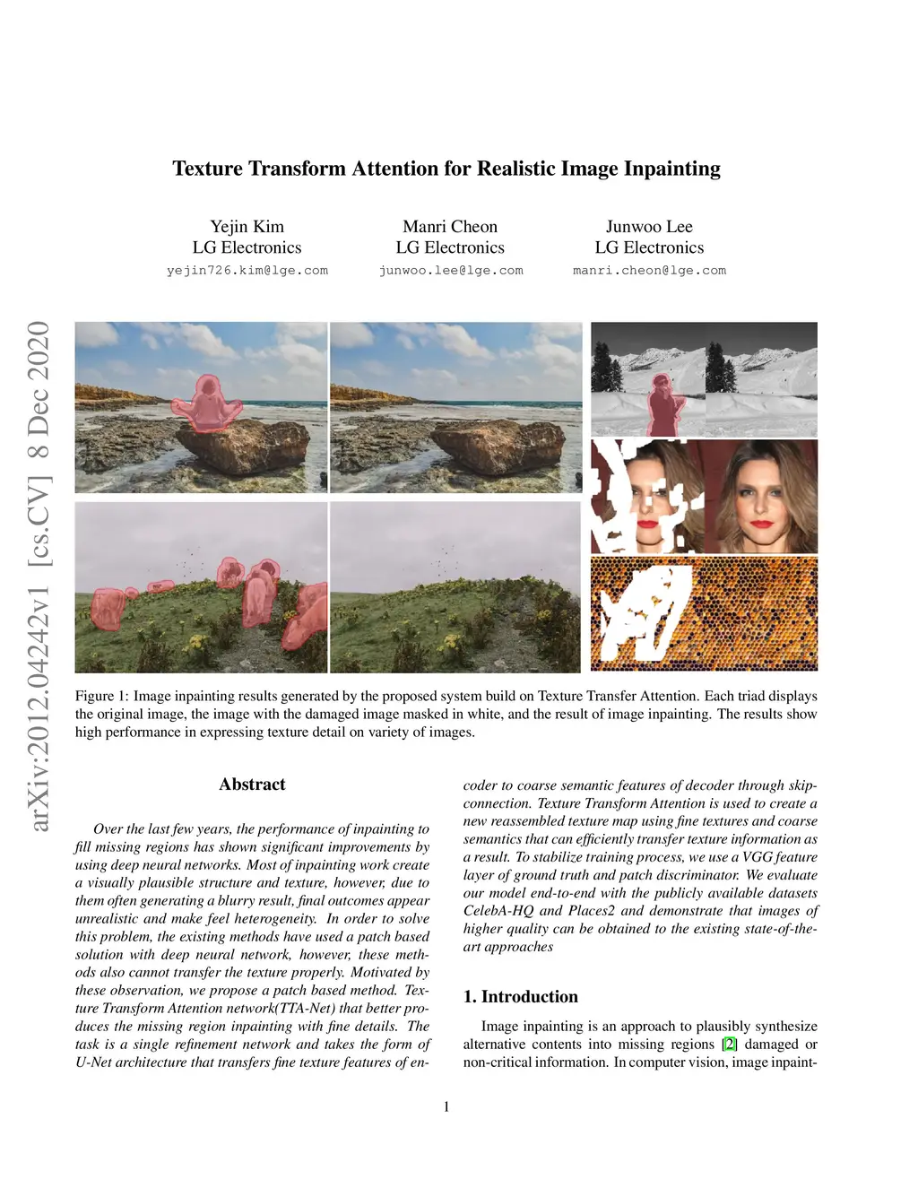 Over the last few years, the performance of inpainting to fill missing regions has shown significant improvements by using deep neural networks. Most of inpainting work create a visually plausible structure and texture, however, due to them often generating a blurry result, final outcomes appear unrealistic and make feel heterogeneity. In order to solve this problem, the existing methods have used a patch based solution with deep neural network, however, these methods also cannot transfer the texture properly. Motivated by these observation, we propose a patch based method. Texture Transform Attention network(TTA-Net) that better produces the missing region inpainting with fine details. The task is a single refinement network and takes the form of U-Net architecture that transfers fine texture features of encoder to coarse semantic features of decoder through skip-connection. Texture Transform Attention is used to create a new reassembled texture map using fine textures and coarse semantics that can efficiently transfer texture information as a result. To stabilize training process, we use a VGG feature layer of ground truth and patch discriminator. We evaluate our model end-to-end with the publicly available datasets CelebA-HQ and Places2 and demonstrate that images of higher quality can be obtained to the existing state-of-the-art approaches.