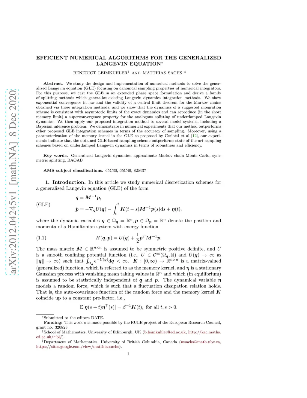 Efficient Numerical Algorithms for the Generalized Langevin Equation