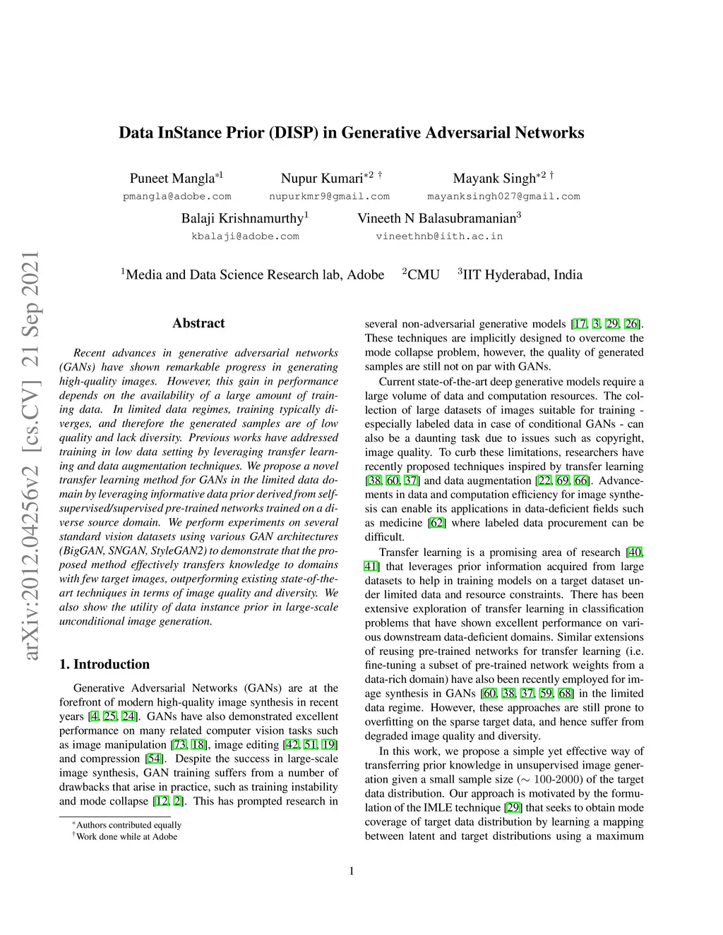 Data InStance Prior (DISP) in Generative Adversarial Networks
