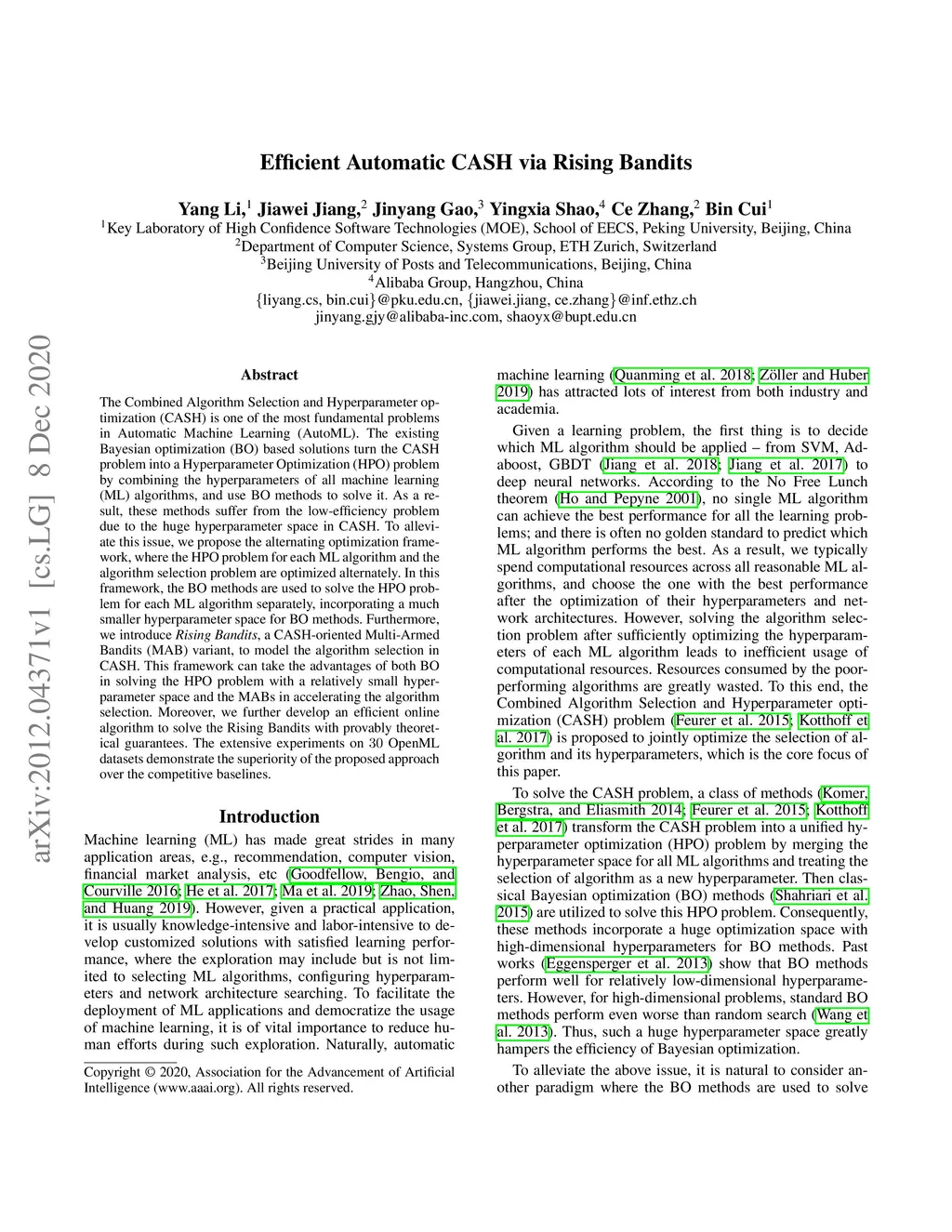 The Combined Algorithm Selection and Hyperparameter optimization (CASH) is one of the most fundamental problems in Automatic Machine Learning (AutoML). The existing Bayesian optimization (BO) based solutions turn the CASH problem into a Hyperparameter Optimization (HPO) problem by combining the hyperparameters of all machine learning (ML) algorithms, and use BO methods to solve it. As a result, these methods suffer from the low-efficiency problem due to the huge hyperparameter space in CASH. To alleviate this issue, we propose the alternating optimization framework, where the HPO problem for each ML algorithm and the algorithm selection problem are optimized alternately. In this framework, the BO methods are used to solve the HPO problem for each ML algorithm separately, incorporating a much smaller hyperparameter space for BO methods. Furthermore, we introduce Rising Bandits, a CASH-oriented Multi-Armed Bandits (MAB) variant, to model the algorithm selection in CASH. This framework can take the advantages of both BO in solving the HPO problem with a relatively small hyperparameter space and the MABs in accelerating the algorithm selection. Moreover, we further develop an efficient online algorithm to solve the Rising Bandits with provably theoretical guarantees. The extensive experiments on 30 OpenML datasets demonstrate the superiority of the proposed approach over the competitive baselines.