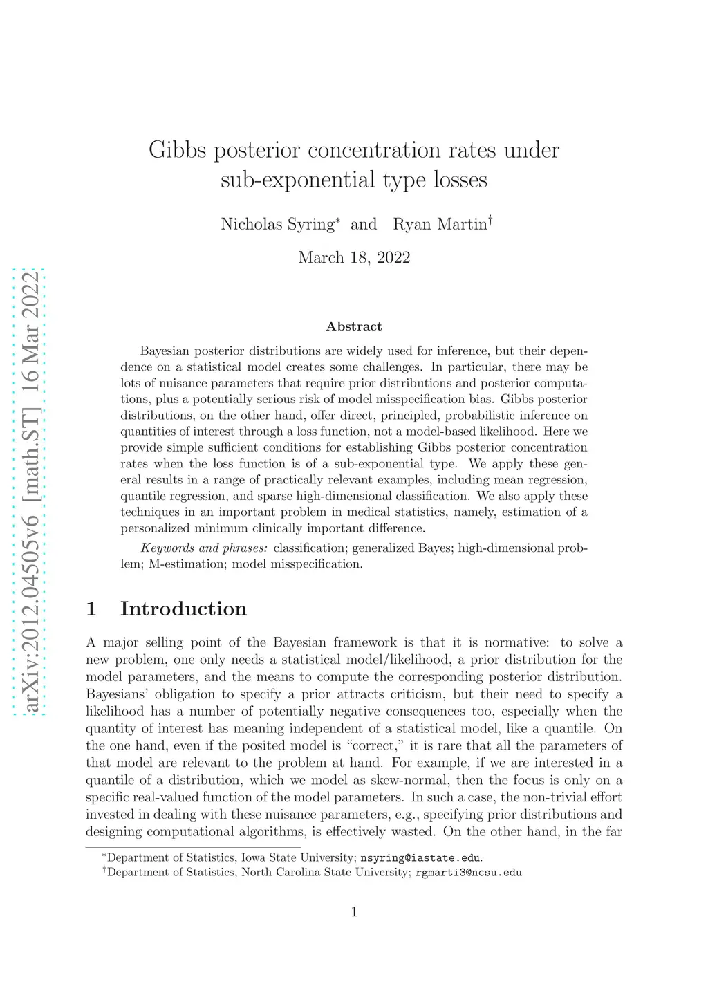 Bayesian posterior distributions are widely used for inference, but their dependence on a statistical model creates some challenges. In particular, there may be lots of nuisance parameters that require prior distributions and posterior computations, plus a potentially serious risk of model misspecification bias. Gibbs posterior distributions, on the other hand, offer direct, principled, probabilistic inference on quantities of interest through a loss function, not a model-based likelihood. Here we provide simple sufficient conditions for establishing Gibbs posterior concentration rates when the loss function is of a sub-exponential type. We apply these general results in a range of practically relevant examples, including mean regression, quantile regression, and sparse high-dimensional classification. We also apply these techniques in an important problem in medical statistics, namely, estimation of a personalized minimum clinically important difference.