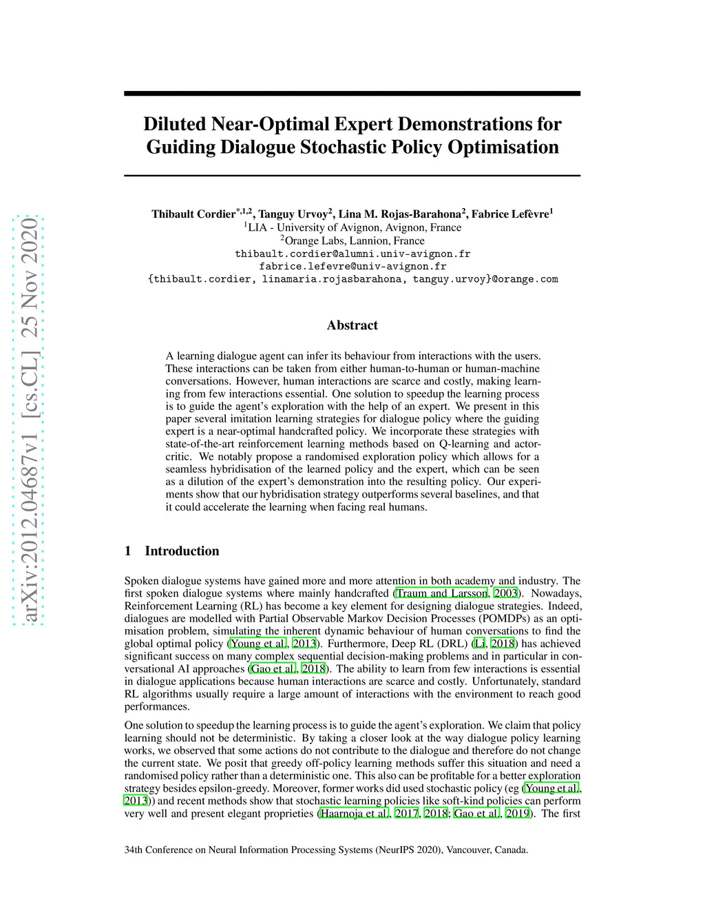 Diluted Near-Optimal Expert Demonstrations for Guiding Dialogue