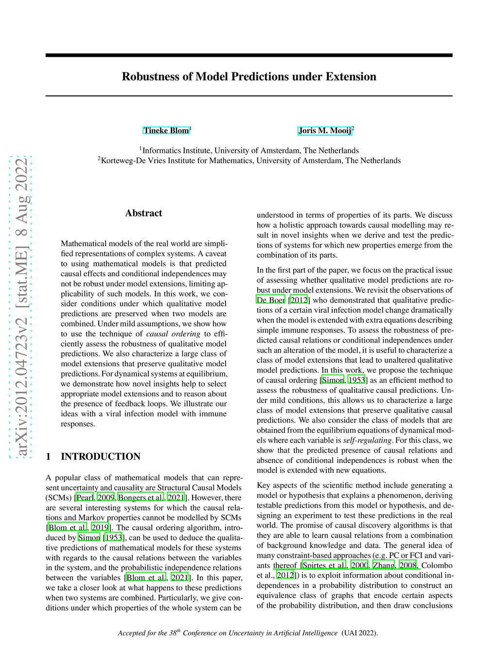 Mathematical models of the real world are simplified representations of complex systems. A caveat to using mathematical models is that predicted causal effects and conditional independences may not be robust under model extensions, limiting applicability of such models. In this work, we consider conditions under which qualitative model predictions are preserved when two models are combined. Under mild assumptions, we show how to use the technique of causal ordering to efficiently assess the robustness of qualitative model predictions. We also characterize a large class of model extensions that preserve qualitative model predictions. For dynamical systems at equilibrium, we demonstrate how novel insights help to select appropriate model extensions and to reason about the presence of feedback loops. We illustrate our ideas with a viral infection model with immune responses.