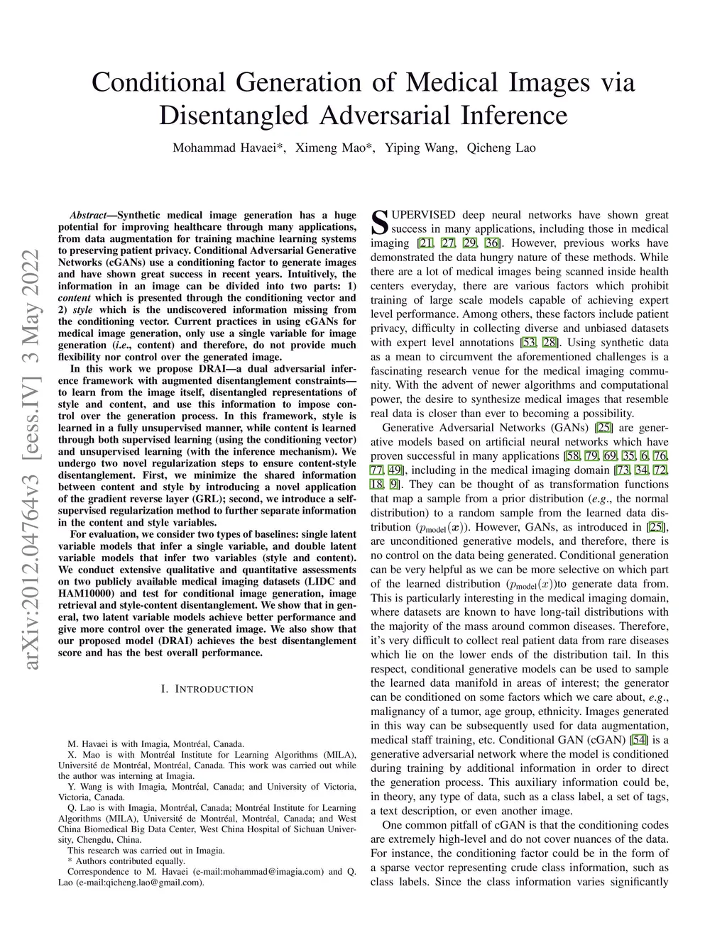 Synthetic medical image generation has a huge potential for improving healthcare through many applications, from data augmentation for training machine learning systems to preserving patient privacy. Conditional Adversarial Generative Networks (cGANs) use a conditioning factor to generate images and have shown great success in recent years. Intuitively, the information in an image can be divided into two parts: 1) content which is presented through the conditioning vector and 2) style which is the undiscovered information missing from the conditioning vector. Current practices in using cGANs for medical image generation, only use a single variable for image generation (i.e., content) and therefore, do not provide much flexibility nor control over the generated image. In this work we propose a methodology to learn from the image itself, disentangled representations of style and content, and use this information to impose control over the generation process. In this framework, style is learned in a fully unsupervised manner, while content is learned through both supervised learning (using the conditioning vector) and unsupervised learning (with the inference mechanism). We undergo two novel regularization steps to ensure content-style disentanglement. First, we minimize the shared information between content and style by introducing a novel application of the gradient reverse layer (GRL); second, we introduce a self-supervised regularization method to further separate information in the content and style variables. We show that in general, two latent variable models achieve better performance and give more control over the generated image. We also show that our proposed model (DRAI) achieves the best disentanglement score and has the best overall performance.