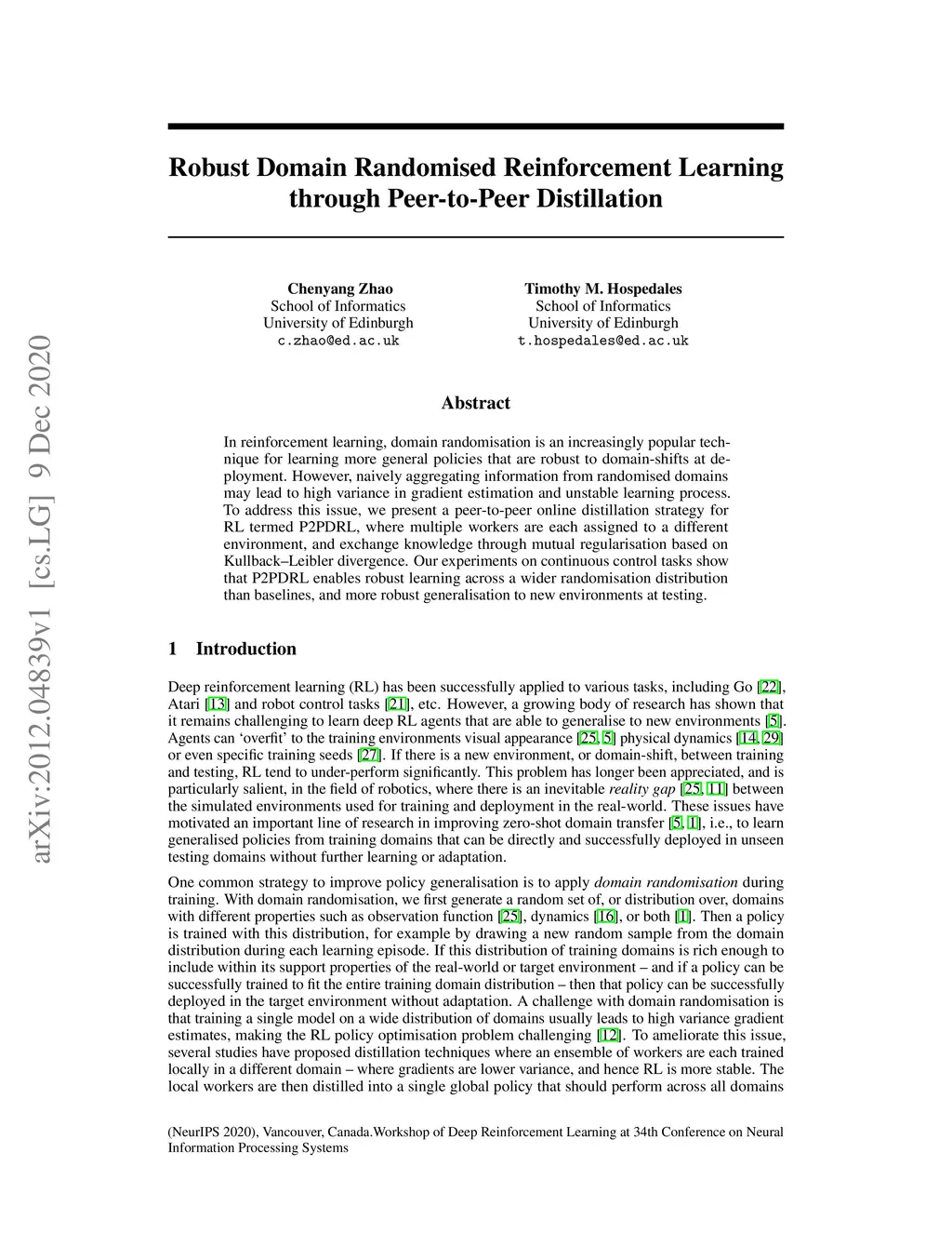 Robust Domain Randomised Reinforcement Learning through Peer-to-Peer