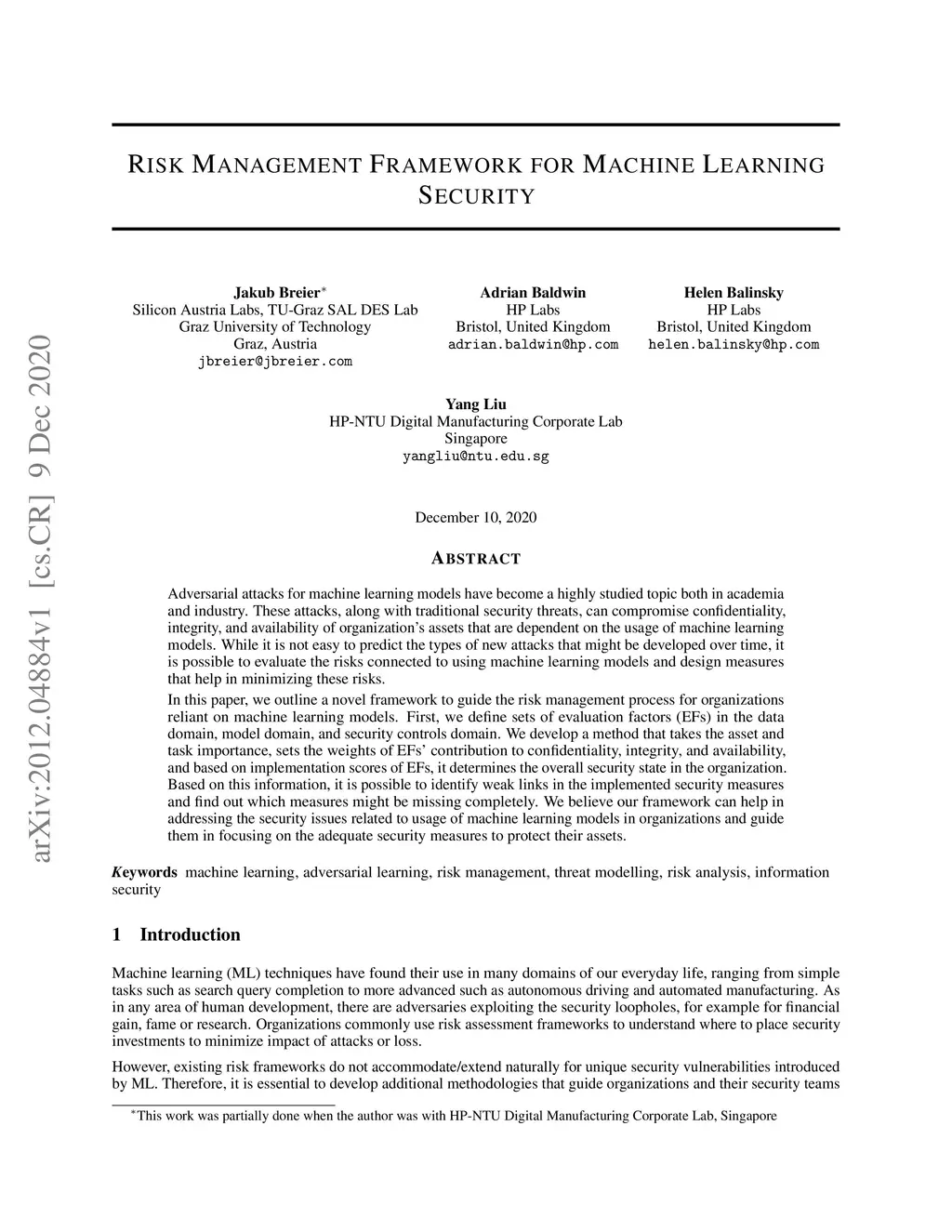 Risk Management Framework for Machine Learning Security