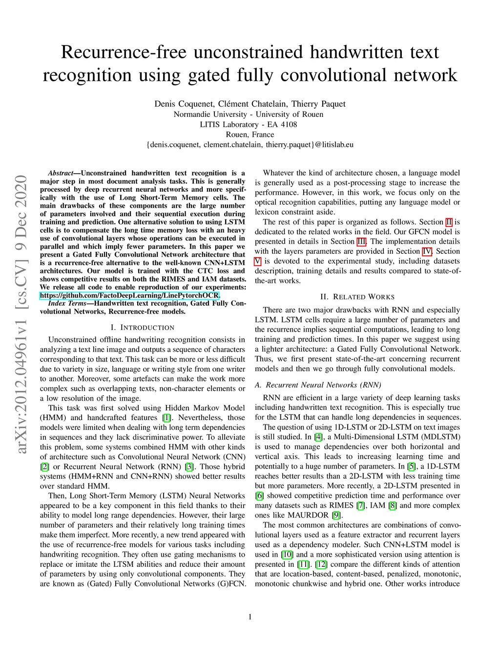 Recurrence-free unconstrained handwritten text recognition using gated