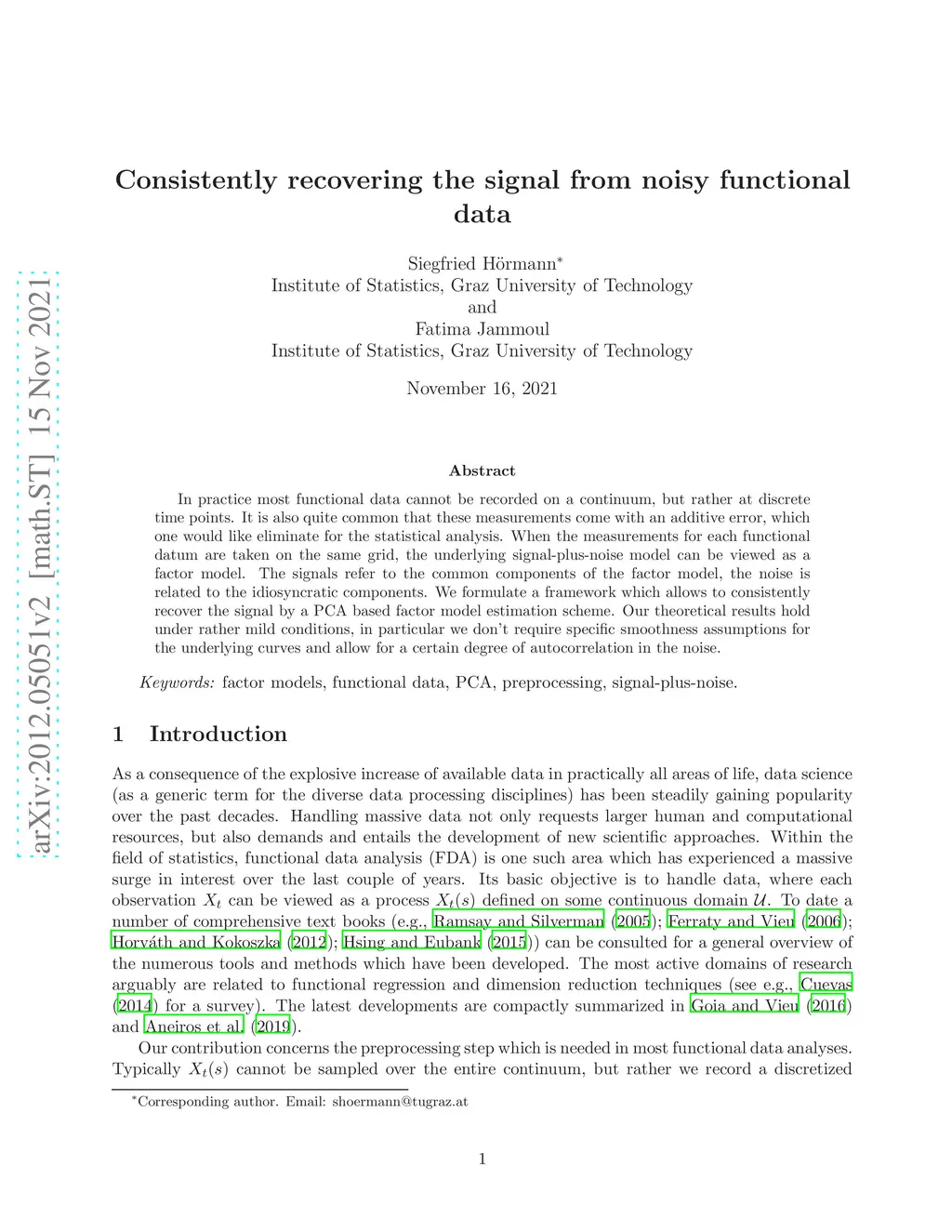 In practice most functional data cannot be recorded on a continuum, but rather at discrete time points. It is also quite common that these measurements come with an additive error, which one would like eliminate for the statistical analysis. When the measurements for each functional datum are taken on the same grid, the underlying signal-plus-noise model can be viewed as a factor model. The signals refer to the common components of the factor model, the noise is related to the idiosyncratic components. We formulate a framework which allows to consistently recover the signal by a PCA based factor model estimation scheme. Our theoretical results hold under rather mild conditions, in particular we don't require specific smoothness assumptions for the underlying curves and allow for a certain degree of autocorrelation in the noise.