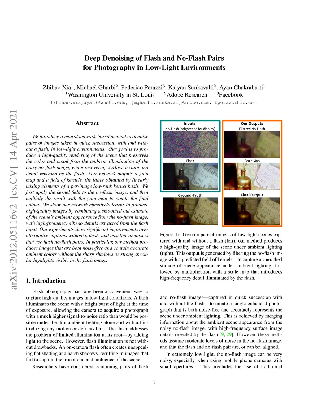 We introduce a neural network-based method to denoise pairs of images taken in quick succession, with and without a flash, in low-light environments. Our goal is to produce a high-quality rendering of the scene that preserves the color and mood from the ambient illumination of the noisy no-flash image, while recovering surface texture and detail revealed by the flash. Our network outputs a gain map and a field of kernels, the latter obtained by linearly mixing elements of a per-image low-rank kernel basis. We first apply the kernel field to the no-flash image, and then multiply the result with the gain map to create the final output. We show our network effectively learns to produce high-quality images by combining a smoothed out estimate of the scene's ambient appearance from the no-flash image, with high-frequency albedo details extracted from the flash input. Our experiments show significant improvements over alternative captures without a flash, and baseline denoisers that use flash no-flash pairs. In particular, our method produces images that are both noise-free and contain accurate ambient colors without the sharp shadows or strong specular highlights visible in the flash image.
