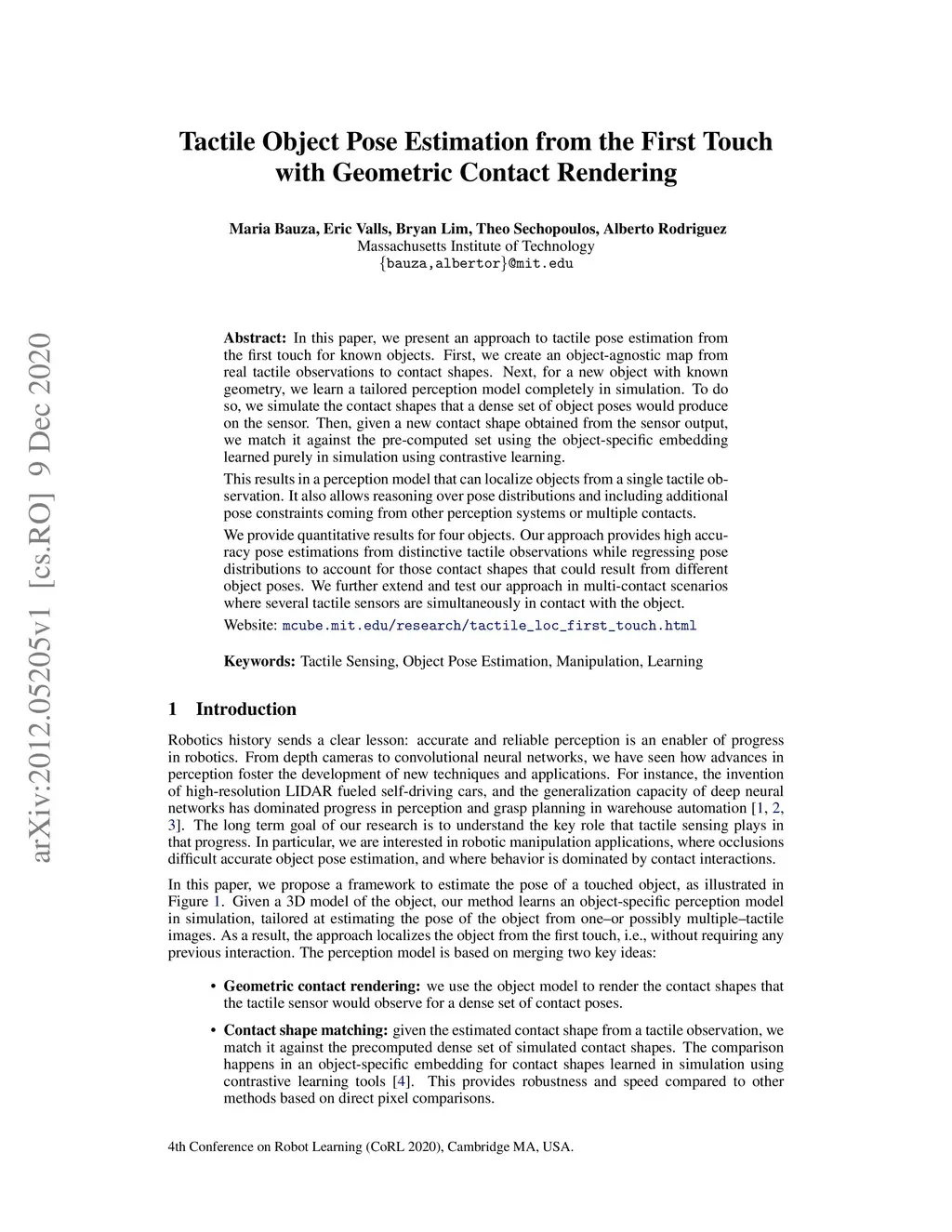 In this paper, we present an approach to tactile pose estimation from the first touch for known objects. First, we create an object-agnostic map from real tactile observations to contact shapes. Next, for a new object with known geometry, we learn a tailored perception model completely in simulation. To do so, we simulate the contact shapes that a dense set of object poses would produce on the sensor. Then, given a new contact shape obtained from the sensor output, we match it against the pre-computed set using the object-specific embedding learned purely in simulation using contrastive learning. This results in a perception model that can localize objects from a single tactile observation. It also allows reasoning over pose distributions and including additional pose constraints coming from other perception systems or multiple contacts. We provide quantitative results for four objects. Our approach provides high accuracy pose estimations from distinctive tactile observations while regressing pose distributions to account for those contact shapes that could result from different object poses. We further extend and test our approach in multi-contact scenarios where several tactile sensors are simultaneously in contact with the object. Website: http://mcube.mit.edu/research/tactile_loc_first_touch.html