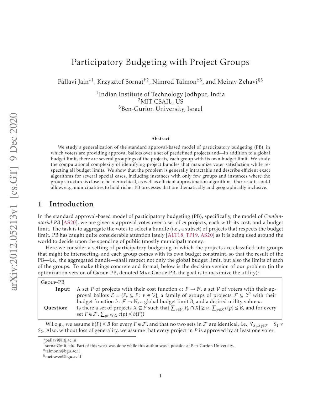 We study a generalization of the standard approval-based model of participatory budgeting (PB), in which voters are providing approval ballots over a set of predefined projects and -- in addition to a global budget limit, there are several groupings of the projects, each group with its own budget limit. We study the computational complexity of identifying project bundles that maximize voter satisfaction while respecting all budget limits. We show that the problem is generally intractable and describe efficient exact algorithms for several special cases, including instances with only few groups and instances where the group structure is close to be hierarchical, as well as efficient approximation algorithms. Our results could allow, e.g., municipalities to hold richer PB processes that are thematically and geographically inclusive.