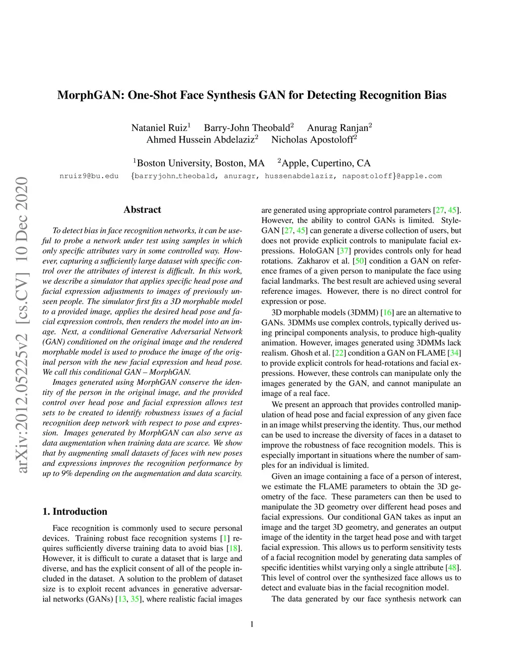 To detect bias in face recognition networks, it can be useful to probe a network under test using samples in which only specific attributes vary in some controlled way. However, capturing a sufficiently large dataset with specific control over the attributes of interest is difficult. In this work, we describe a simulator that applies specific head pose and facial expression adjustments to images of previously unseen people. The simulator first fits a 3D morphable model to a provided image, applies the desired head pose and facial expression controls, then renders the model into an image. Next, a conditional Generative Adversarial Network (GAN) conditioned on the original image and the rendered morphable model is used to produce the image of the original person with the new facial expression and head pose. We call this conditional GAN -- MorphGAN. Images generated using MorphGAN conserve the identity of the person in the original image, and the provided control over head pose and facial expression allows test sets to be created to identify robustness issues of a facial recognition deep network with respect to pose and expression. Images generated by MorphGAN can also serve as data augmentation when training data are scarce. We show that by augmenting small datasets of faces with new poses and expressions improves the recognition performance by up to 9% depending on the augmentation and data scarcity.