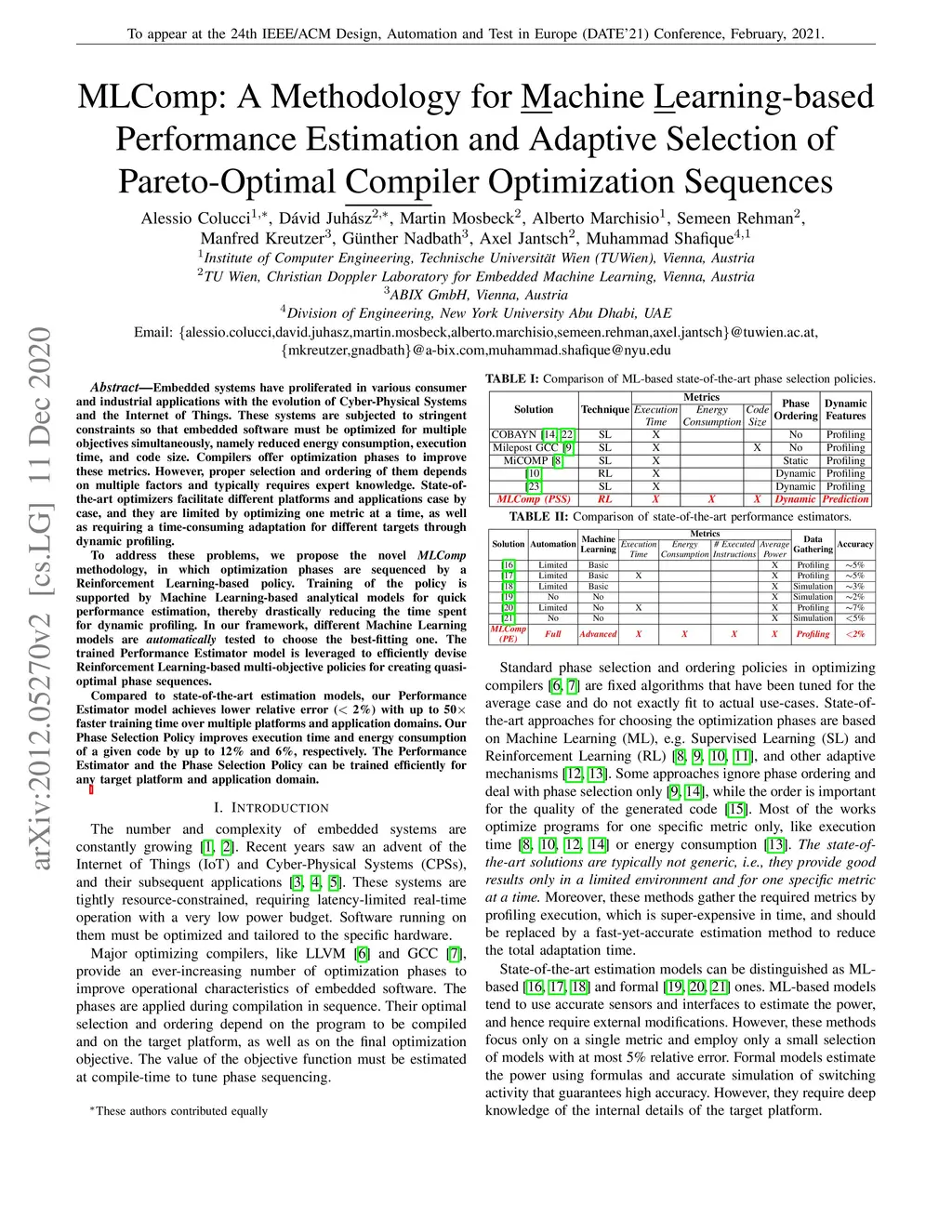 Embedded systems have proliferated in various consumer and industrial applications with the evolution of Cyber-Physical Systems and the Internet of Things. These systems are subjected to stringent constraints so that embedded software must be optimized for multiple objectives simultaneously, namely reduced energy consumption, execution time, and code size. Compilers offer optimization phases to improve these metrics. However, proper selection and ordering of them depends on multiple factors and typically requires expert knowledge. State-of-the-art optimizers facilitate different platforms and applications case by case, and they are limited by optimizing one metric at a time, as well as requiring a time-consuming adaptation for different targets through dynamic profiling. To address these problems, we propose the novel MLComp methodology, in which optimization phases are sequenced by a Reinforcement Learning-based policy. Training of the policy is supported by Machine Learning-based analytical models for quick performance estimation, thereby drastically reducing the time spent for dynamic profiling. In our framework, different Machine Learning models are automatically tested to choose the best-fitting one. The trained Performance Estimator model is leveraged to efficiently devise Reinforcement Learning-based multi-objective policies for creating quasi-optimal phase sequences. Compared to state-of-the-art estimation models, our Performance Estimator model achieves lower relative error (<2%) with up to 50x faster training time over multiple platforms and application domains. Our Phase Selection Policy improves execution time and energy consumption of a given code by up to 12% and 6%, respectively. The Performance Estimator and the Phase Selection Policy can be trained efficiently for any target platform and application domain.